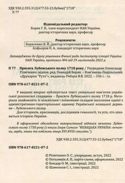 Публікація присяжних списків жителів Лубенського полку Гетьманщини за 1718 рік. Книга містить поіменні реєстри різних тогочасних станів — козаків, старшини, посполитих селян, міщан, духовенства.