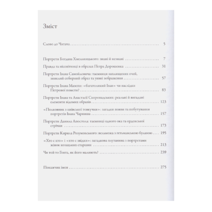 Книга містить десять нарисів з історії давньої та сучасної іконографії відомих українських гетьманів, полковників, сотників та їхніх матерів і дружин. У захопливій формі читачам запропоновано дізнатися, який зі збережених портретів демонструє нам справжнього Івана Мазепу, замислитися, чи дійсно Петро Дорошенко виглядав так, як його малювали художники, довідатися, чому Івана Самойловича зображено із заплющеними очима, з’ясувати, яким насправді був Іван Гонта, уявити, якою мала бути на портреті поважна гетьманша чи полковниця, та розвідати, чому відбуваються підміни портретованих. Книжка адресована науковцям, викладачам, студентам, а також усім, хто цікавиться історією та культурою України козацьких часів і готовий побачити наше минуле крізь призму дивовижних історій портретів її видатних діячів.