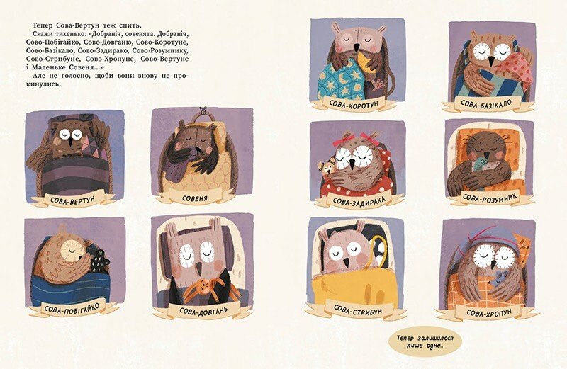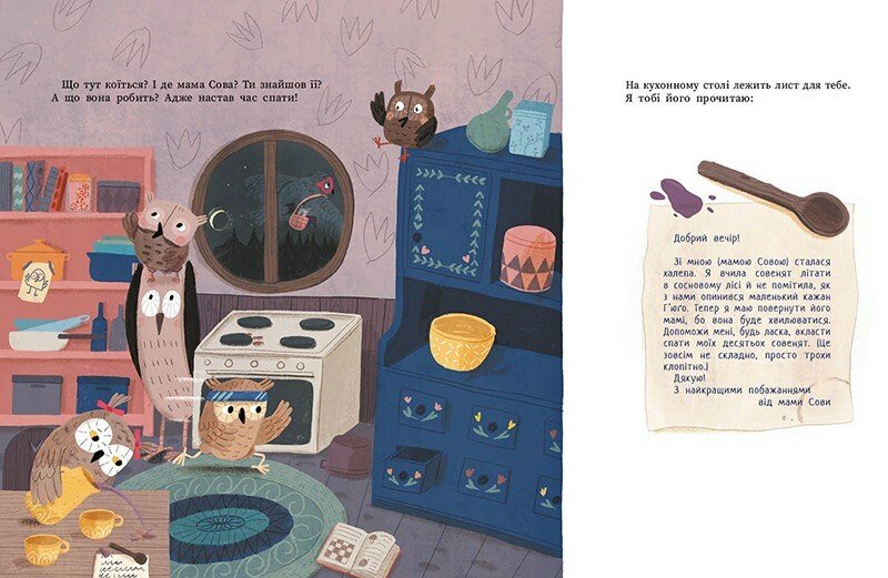 Сьогодні мама-сова вчила своїх діток літати. Але увечері помітила серед совенят маленького кажанчика і тепер має швидко повернути його додому. Хто тепер укладе совенят спати? Книжка для дітей від 3 років на тему засинання, з вечірніми ритуалами й гумором. Діти беруть на себе роль мами-сови й допомагають вкладати совенят, роблячи все разом з ними.