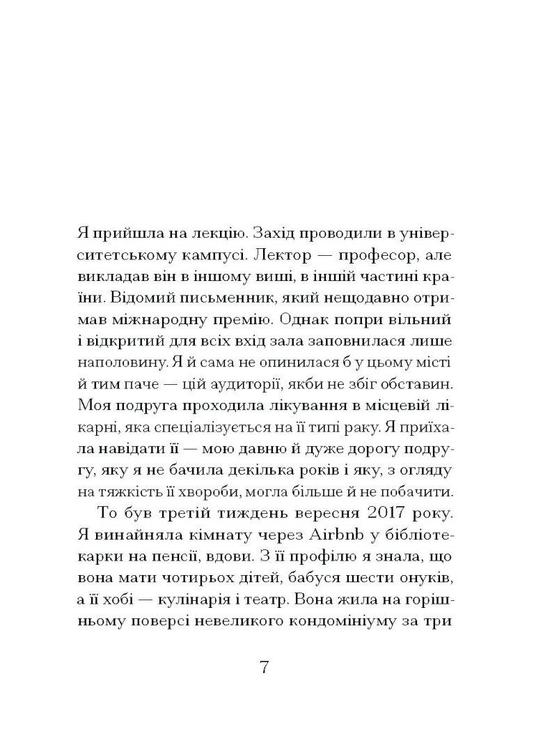 У звичному перебігу життя героїня зустрічає різних людей: колишнього, який переконує, що кінець світу не за горами, власницю житла на Airbnb, яка не вміє спілкуватися з гостями, незнайомця, що просить допомогти розважити його стареньку матір, подругу юності, яка бореться з невиліковною хворобою. Їх усіх об’єднує спільна потреба — розповісти про себе, знайти того, хто почує їхні історії. Вона сприймає цей хор голосів як пасивна слухачка, аж доки не лунає незвичайне прохання.