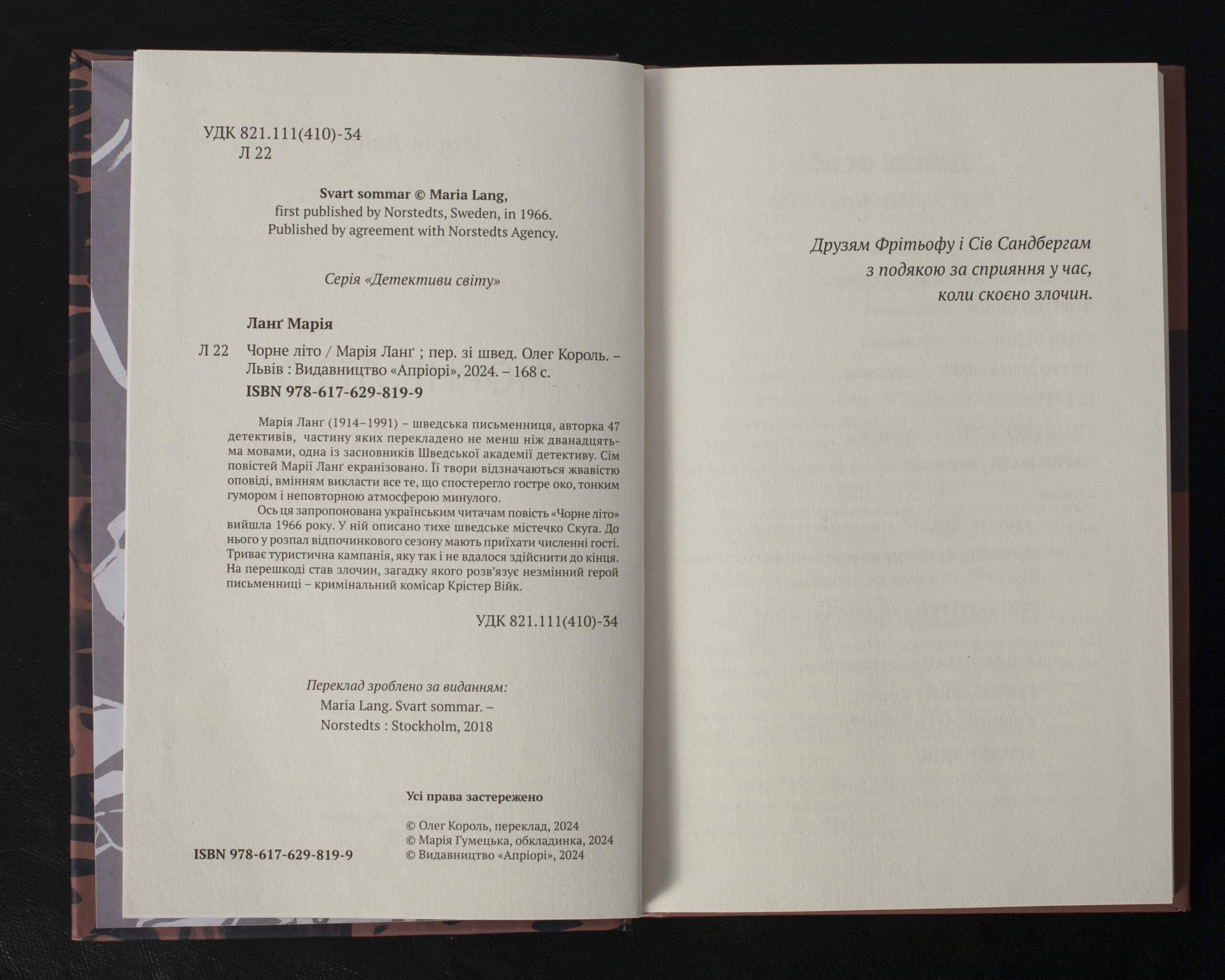 У романі “Чорне літо” Марія Ланґ майстерно змальовує атмосферу тихого шведського містечка Скуґа, де літня туристична ідилія порушується загадковим злочином. Головний герой серії романів, кримінальний комісар Крістер Війк, береться за розслідування справи, яка загрожує зірвати туристичний сезон. Авторка вправно поєднує елементи класичного детективу з тонким гумором та яскравими описами шведської провінції 1960-х рр. Це перший переклад роману українською мовою.