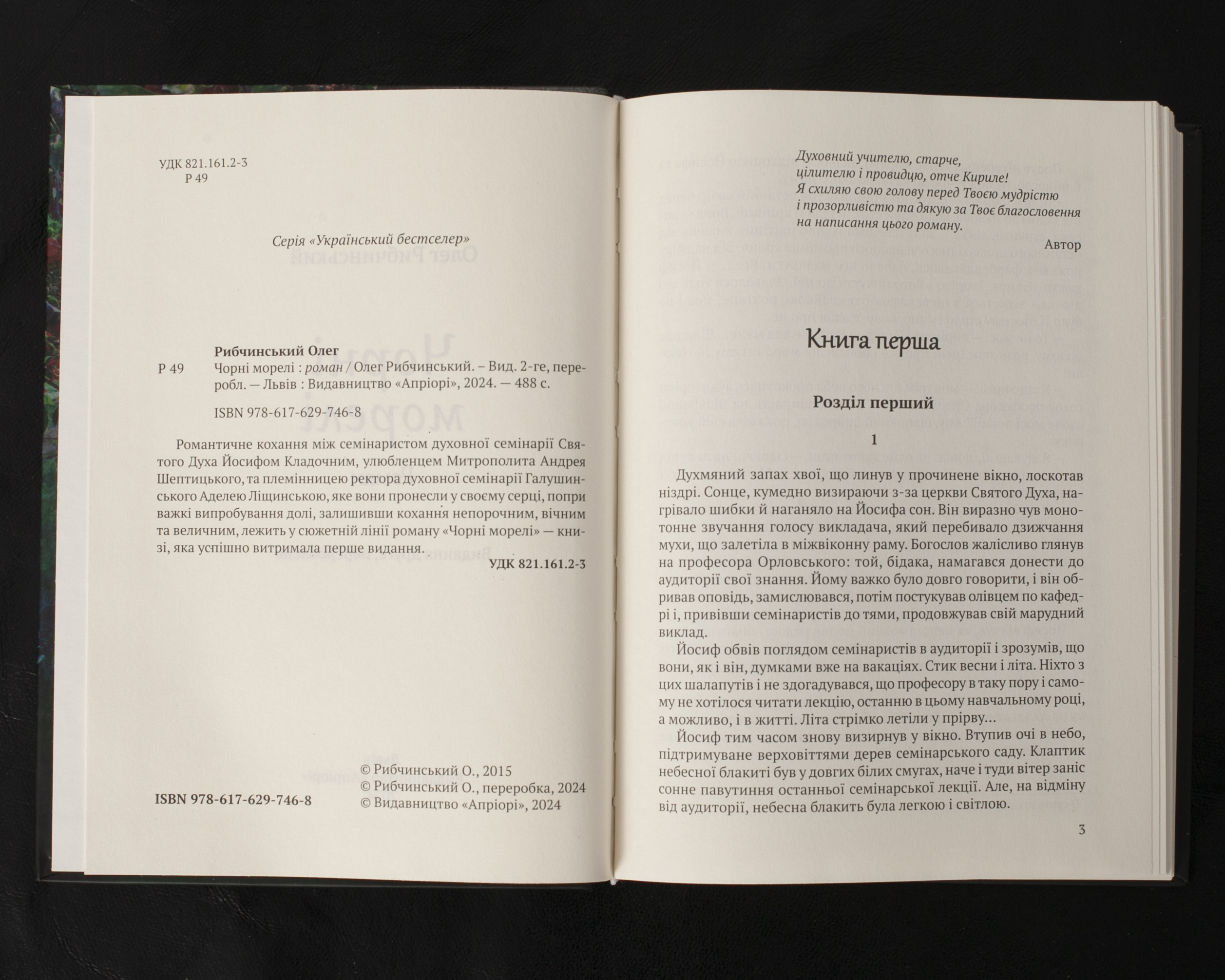 Роман “Чорні морелі” розповідає історію чистого та глибокого почуття між семінаристом Йосифом Кладочним, якого опікує сам митрополит Андрей Шептицький, та Аделею Ліщинською, племінницею ректора духовної семінарії. Їхнє кохання, що розгортається в стінах львівської духовної семінарії Святого Духа, проходить через складні випробування, але залишається непорочним і вічним. Друге, перероблене видання роману, що здобув популярність серед читачів, глибоко занурює в атмосферу довоєнного Львова та життя греко-католицького духовенства.