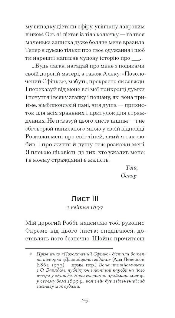 «Настане день, коли правда має відкритися — можливо, не за мого життя… але я не готовий навічно лишитися при гротескному ганебному стовпі, до якого мене поста- вили», — пише Оскар Вайлд другові Роберту Россу, пере- даючи рукопис, згодом знаний під назвою «De Profundis». Це послання він написав у Редінзькій в’язниці, де відбу- вав покарання за «любов, яка назватися не сміє». Так в одному вірші пише Альфред Дуґлас, пристрасна дружба з яким і згубила Вайлда та призвела до ув’язнення