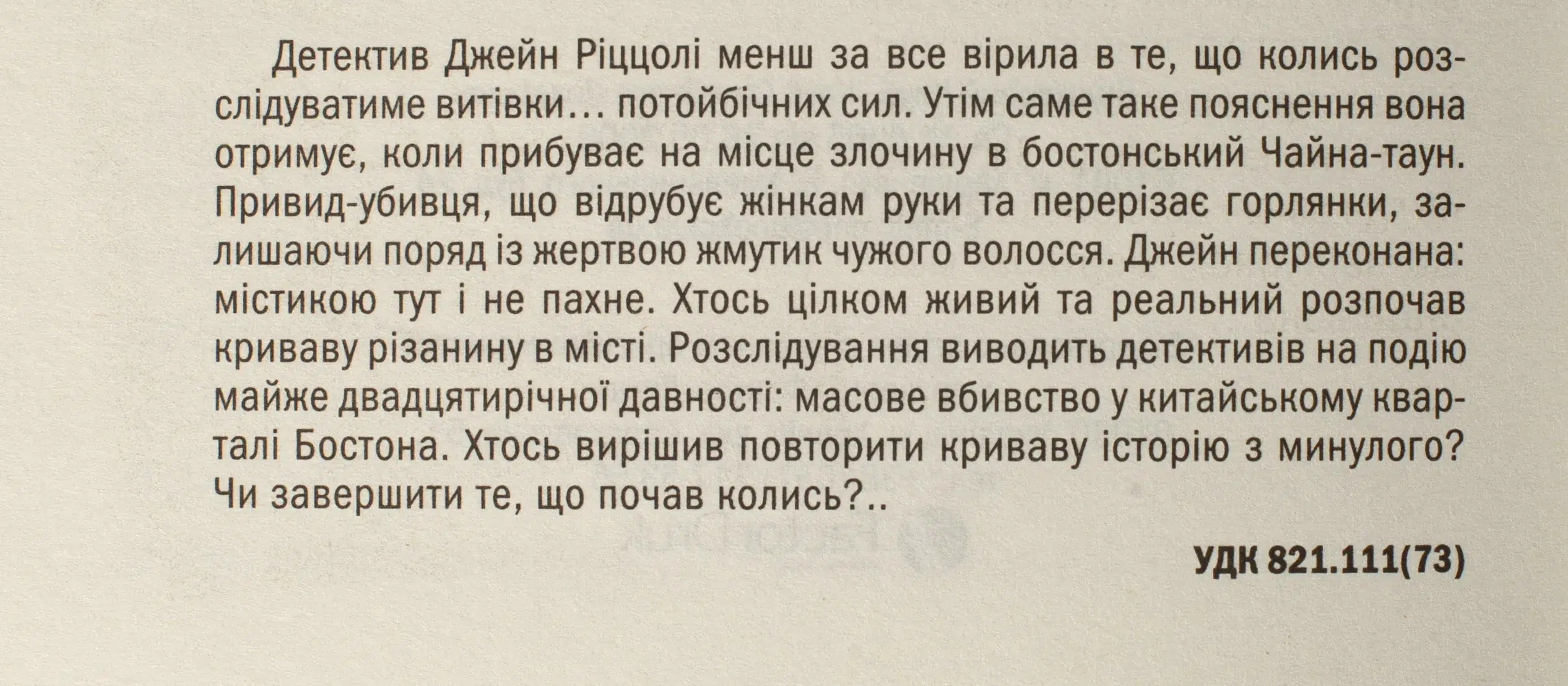 Детектив Джейн Ріццолі менш за все вірила в те, що колись розслідуватиме витівки… потойбічних сил? Утім саме таке пояснення вона отримує, коли прибуває на місце злочину в бостонський Чайна-таун. Привид-убивця, що відрубує жінкам руки та перерізає горлянки, залишаючи поряд із жертвою жмутик чужого волосся. Джейн переконана: містикою тут і не пахне. Хтось цілком живий та реальний розпочав криваву різанину в місті. Розслідування виводить детективів на подію майже двадцятирічної давності: масове вбивство у китайському кварталі Бостона. Хтось вирішив повторити криваву історію з минулого? Чи завершити те, що почав колись?