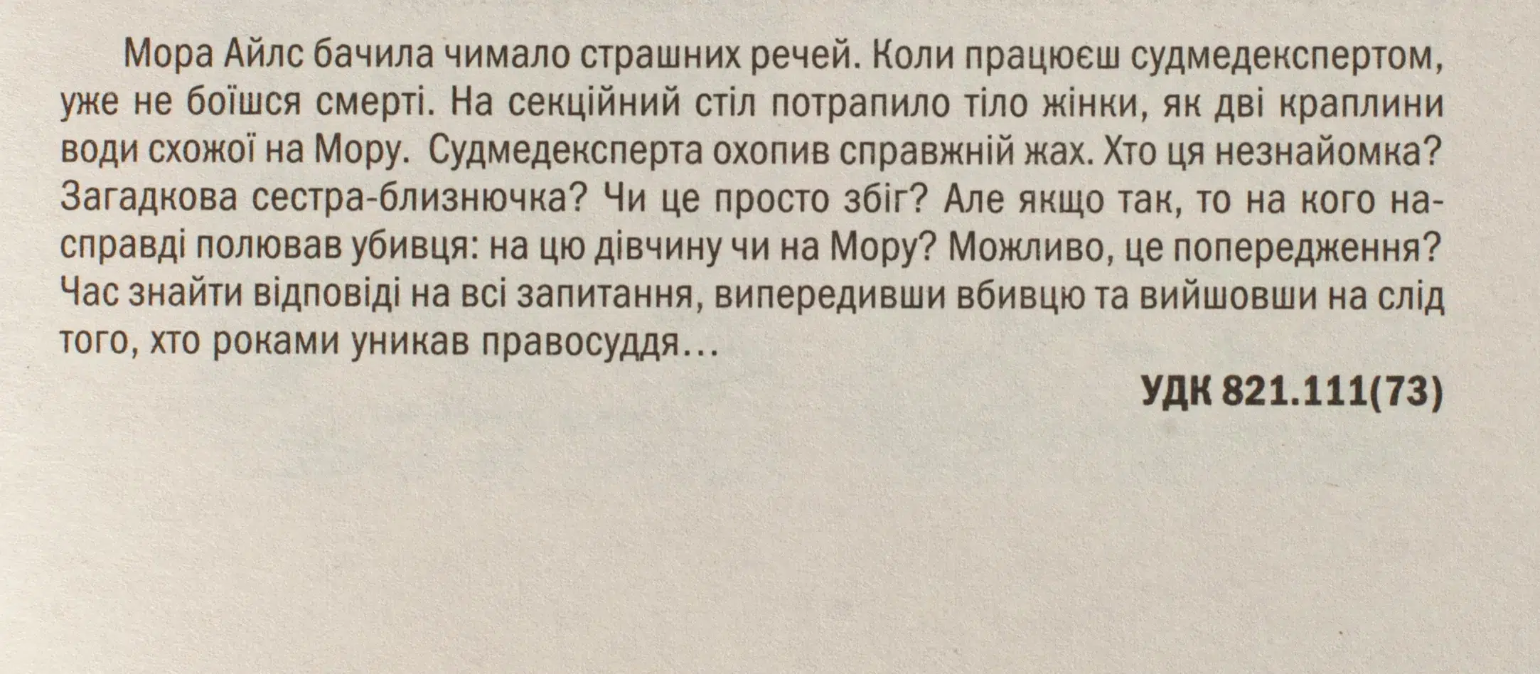 Мора Айлз бачила чимало страшних речей. Коли працюєш судмедекспертом, вже не боїшся смерті. На секційний стіл потрапило тіло жінки, як дві краплі води схожої на Мору. Судмедексперта охопив справжній жах. Хто ця незнайомка? Загадкова сестра-близнючка? Чи це просто збіг? Але якщо так, то на кого насправді полював убивця: на цю дівчину чи на Мору? Можливо, це попередження? Час знайти відповіді на всі запитання, випередивши вбивцю та вийшовши на слід того, хто роками уникав правосуддя…
