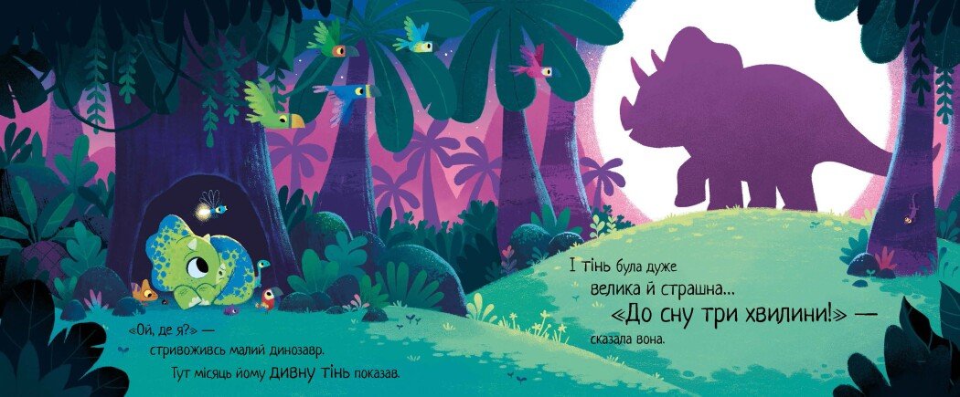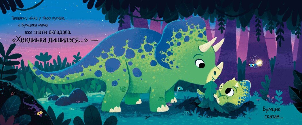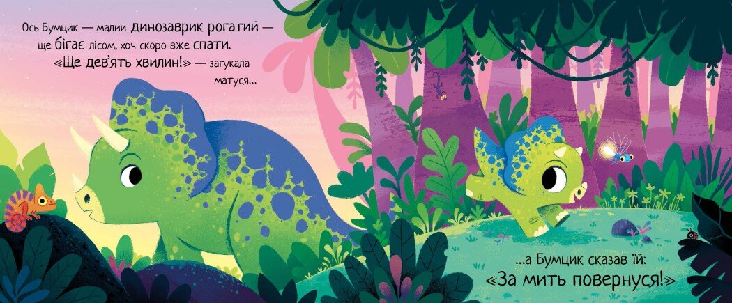 Віршована історія на ніч. За десять хвилин усім динозаврикам пора спати, а маленький Бумцик бадьорий і спати зовсім не хоче! Пробіжимося з ним вечірніми джунглями, поки мама-динозавр рахує хвилини до сну. Книжка-бестселер від Ріаннон Філдінг і Кріса Чаттертона, яка чудово допомагає малю- кам заспокоїтися перед сном.