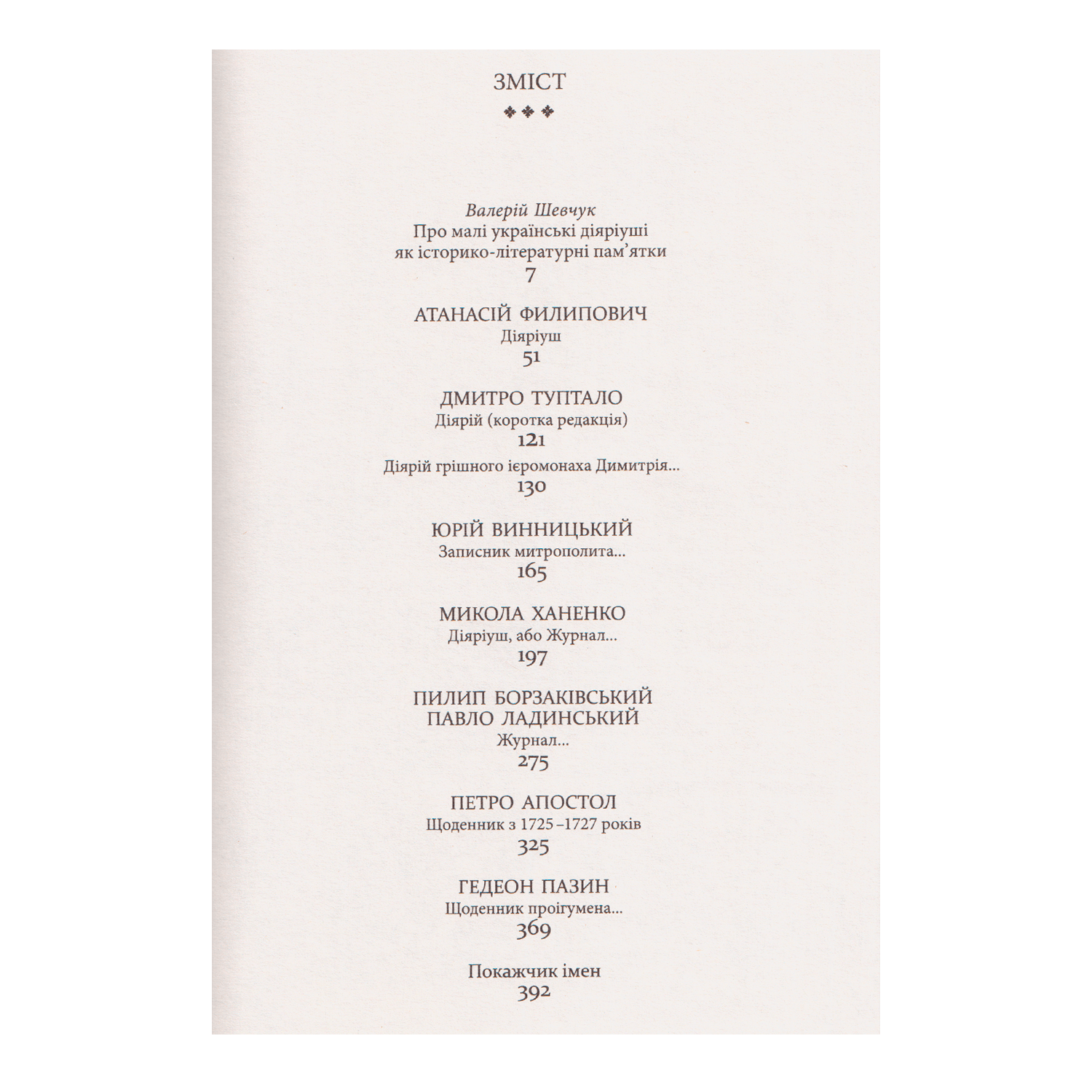 До видання увійшли сім щоденників відомих церковних діячів та представників правлячої верхівки (Атанасія Филиповича, Дмитра Туптала, Юрія Винницького, Миколи Ханенка, Пилипа Борзаківського та Павла Ладинського, Петра Апостола, Гедеона Пазина), які описують тогочасну картину життя як на українських так і закордонних землях 17-18 ст.