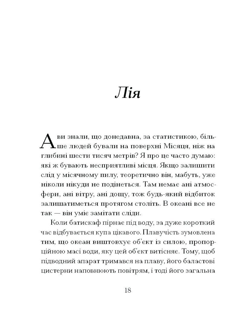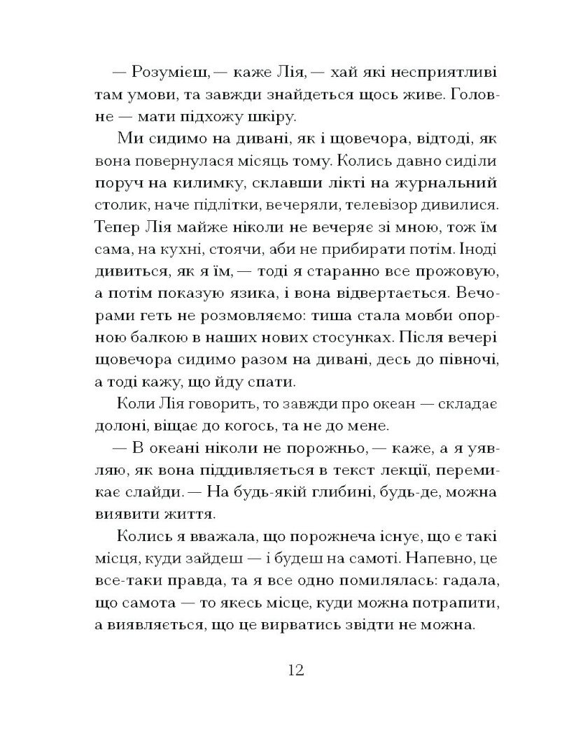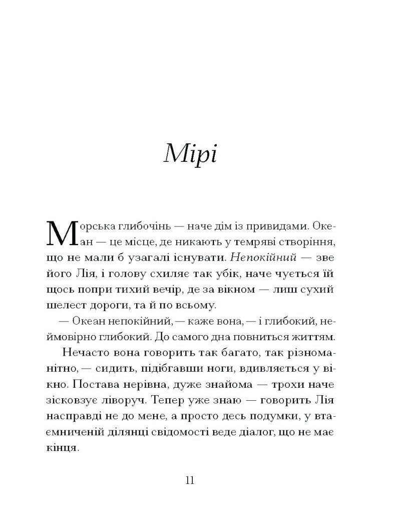 «Здається, в такі моменти вона роздумує, зануритись туди чи ні, хоча іноді на обличчі проступає тривога — ніби довго вдивлялася в глибочінь і тепер не може звідти вирватися…» Майже зневірившись, Мірі нарешті дочекалася повернення своєї дружини Лії з глибоководної місії. Проте незабаром стає зрозуміло, що якісь таємничі події десь там, на морському дні, змінили жінку назавжди. Вона повернулася, проте ніби не тут. Тепер Мірі живе спогадами, намагається зрозуміти, підтримати та продовжувати любити…