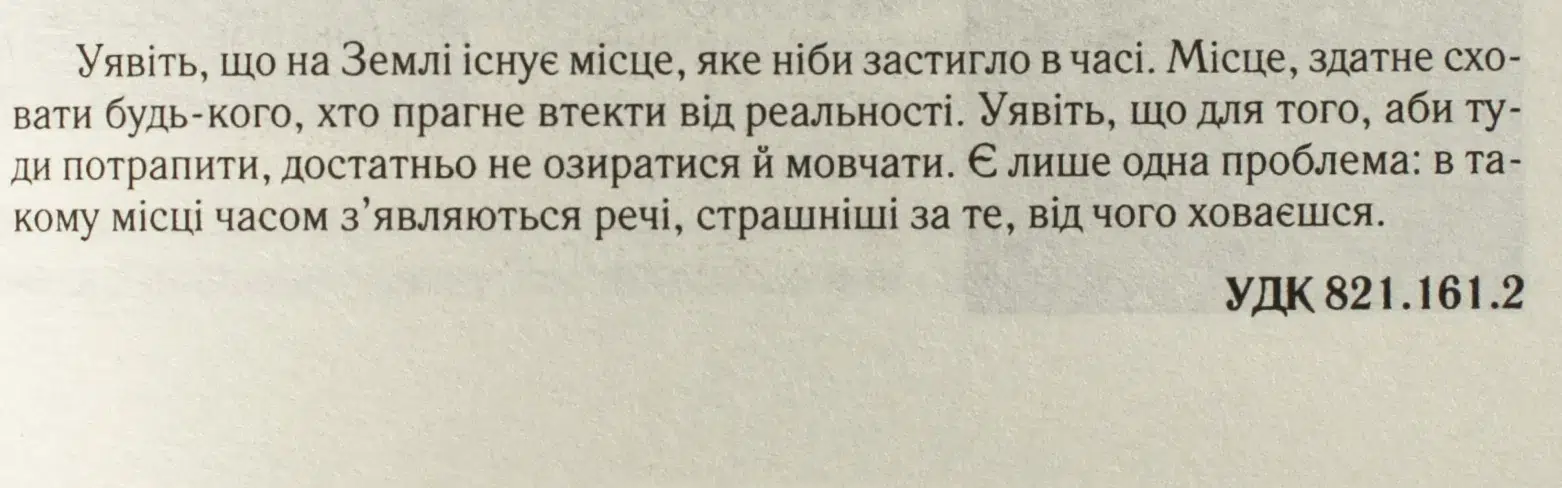 Уявіть, що на Землі існує місце, яке ніби застигло в часі. Місце, здатне сховати будь-кого, хто прагне втекти від реальності. Уявіть, що для того, аби туди потрапити, достатньо не озиратися й мовчати. Є лише одна проблема: в такому місці часом з’являються речі, страшніші за те, від чого ховаєшся.