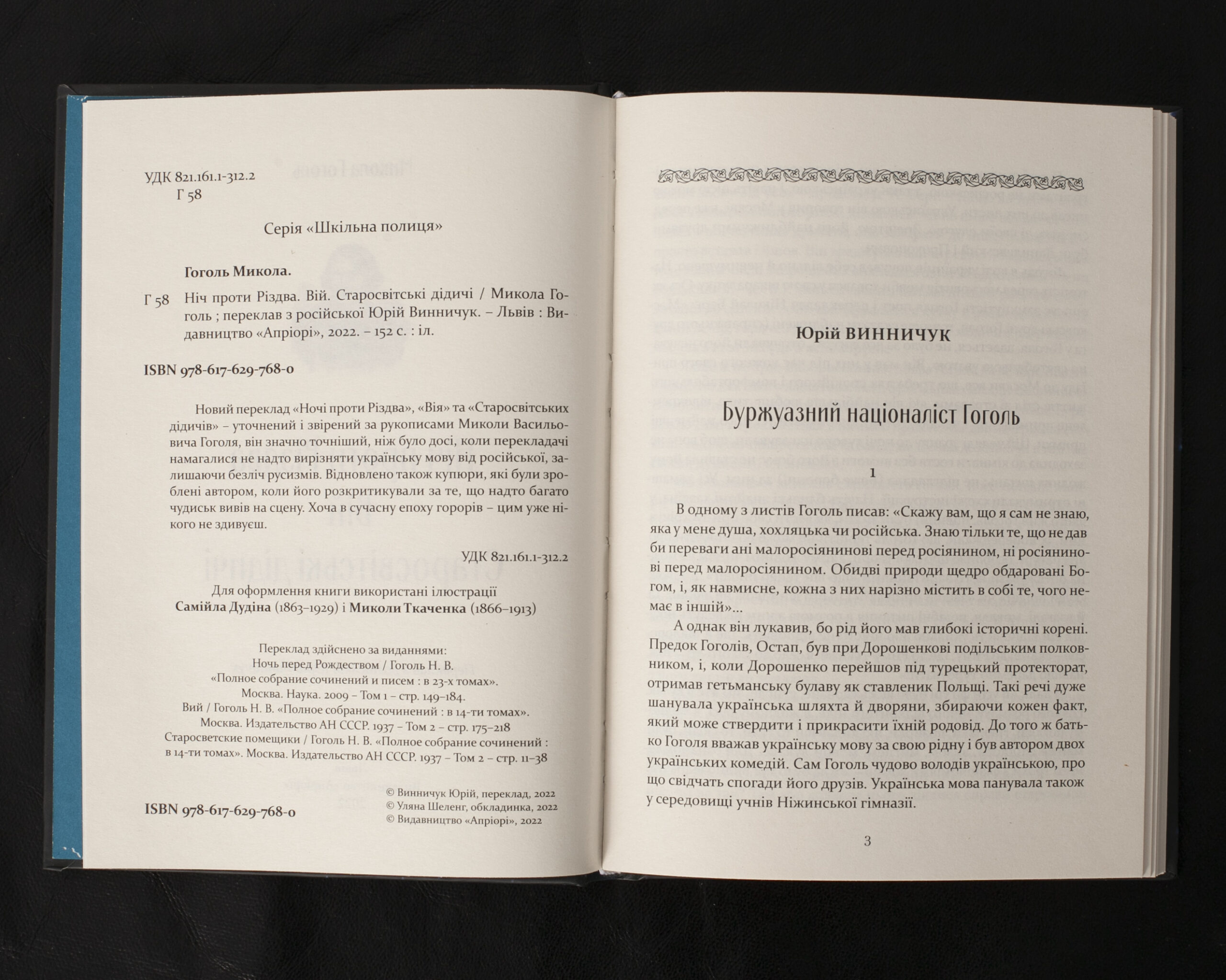 Видання містить три найвідоміші повісті з циклу “Вечори на хуторі біля Диканьки” та “Миргород” у новому перекладі. Особливістю цього видання є відновлення авторського тексту за оригінальними рукописами, включно з фрагментами, що були вилучені через цензурні міркування. Переклад очищено від русизмів, які були характерні для попередніх версій, що дозволяє краще відчути колорит української мови та атмосферу творів. До збірки увійшли містична історія кохання коваля Вакули “Ніч проти Різдва”, моторошна повість “Вій” та лірична новела про старосвітське життя “Старосвітські дідичі”.