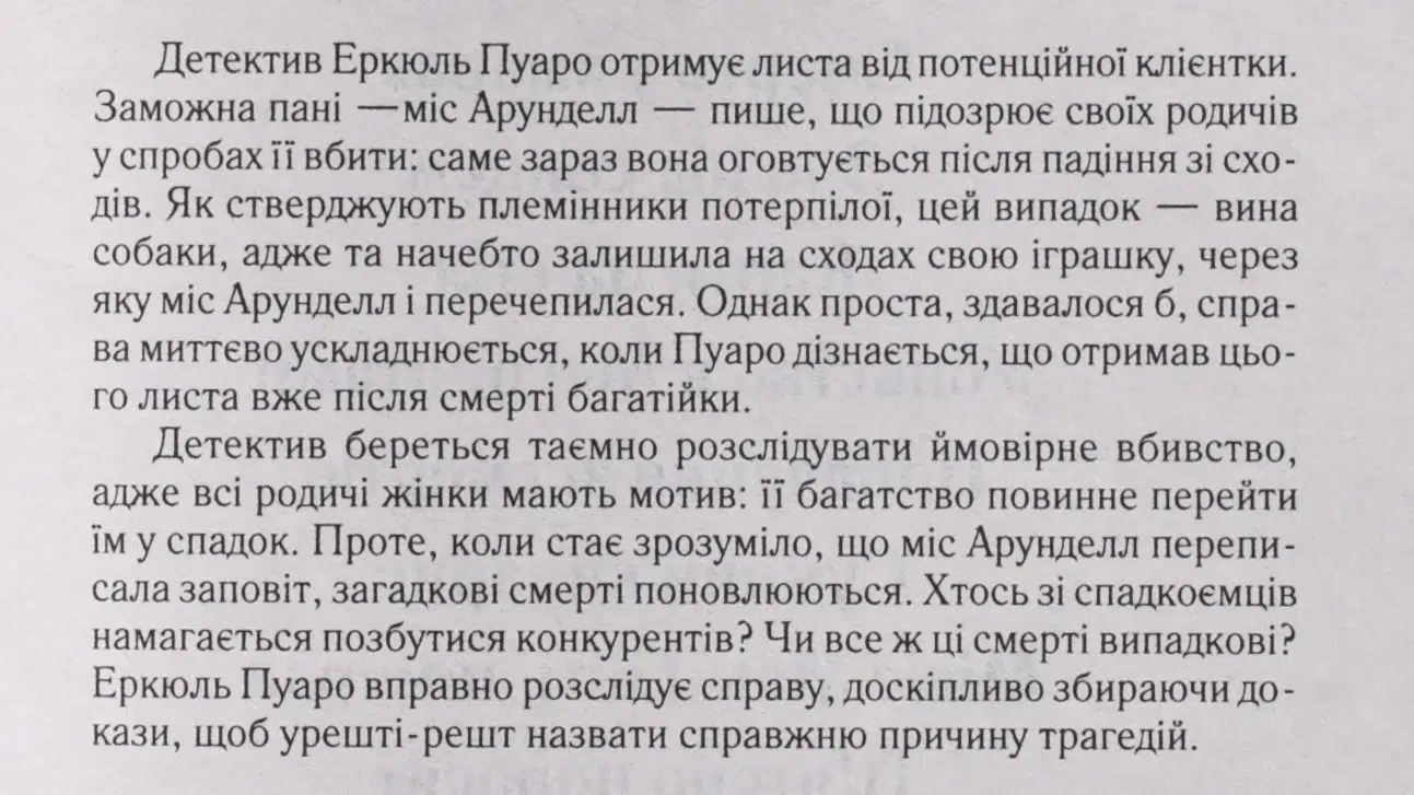 Класичний детектив світового масштабу. Детектив Еркюль Пуаро отримує листа від потенційної клієнтки. Заможна пані — міс Арунделл — пише, що підозрює своїх родичів у спробах її вбити: саме зараз вона оговтується після падіння зі сходів. Як стверджують племінники потерпілої, цей випадок — вина собаки, адже та начебто залишила на сходах свою іграшку, через яку міс Арунделл і перечепилася. Однак проста, здавалося б, справа миттєво ускладнюється, коли Пуаро дізнається, що отримав цього листа вже після смерті багатійки. Детектив береться таємно розслідувати ймовірне вбивство, адже всі родичі жінки мають мотив: її багатство повинне перейти їм у спадок. Проте, коли стає зрозуміло, що міс Арунделл переписала заповіт, загадкові смерті поновлюються. Хтось зі спадкоємців намагається позбутися конкурентів? Чи все ж ці смерті випадкові? Еркюль Пуаро вправно розслідує справу, доскіпливо збираючи докази, щоб урешті-решт назвати справжню причину трагедій.