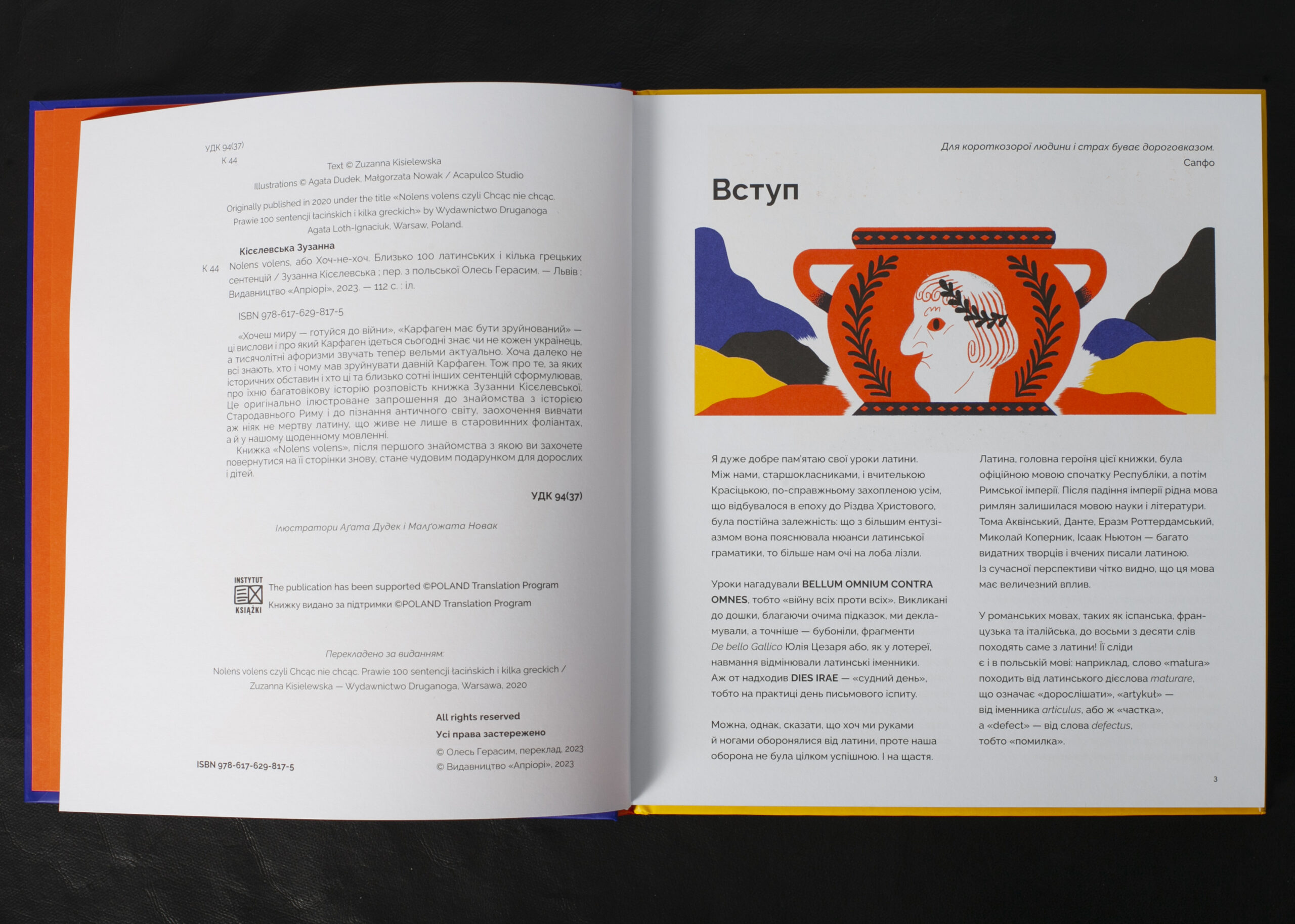 Зузанна Кісєлевська розкриває походження та історичний контекст близько сотні латинських і кількох грецьких сентенцій, які не втратили своєї актуальності й сьогодні. Авторка майстерно поєднує історичні факти, культурологічні коментарі та сучасні паралелі, показуючи, як давні вислови знаходять нове життя в теперішньому світі. Особлива увага приділяється тим сентенціям, які набули нового звучання в контексті сучасних подій в Україні. Книга оформлена оригінальними ілюстраціями, що роблять знайомство з античною мудрістю ще цікавішим.