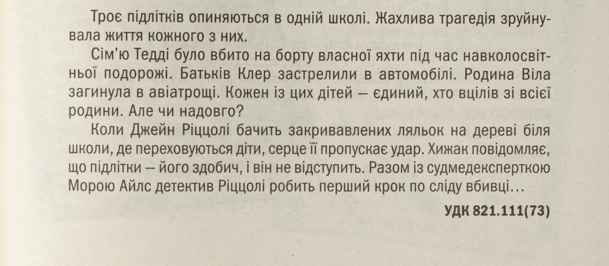 Коли Джейн Ріццолі бачить закривавлених ляльок на дереві біля школи, де переховуються діти, серце її пропускає удар. Хижак повідомляє, що підлітки — його здобич, і він не відступить. Разом із судмедексперткою Морою Айлс детектив Ріццолі робить перший крок по сліду вбивці…
