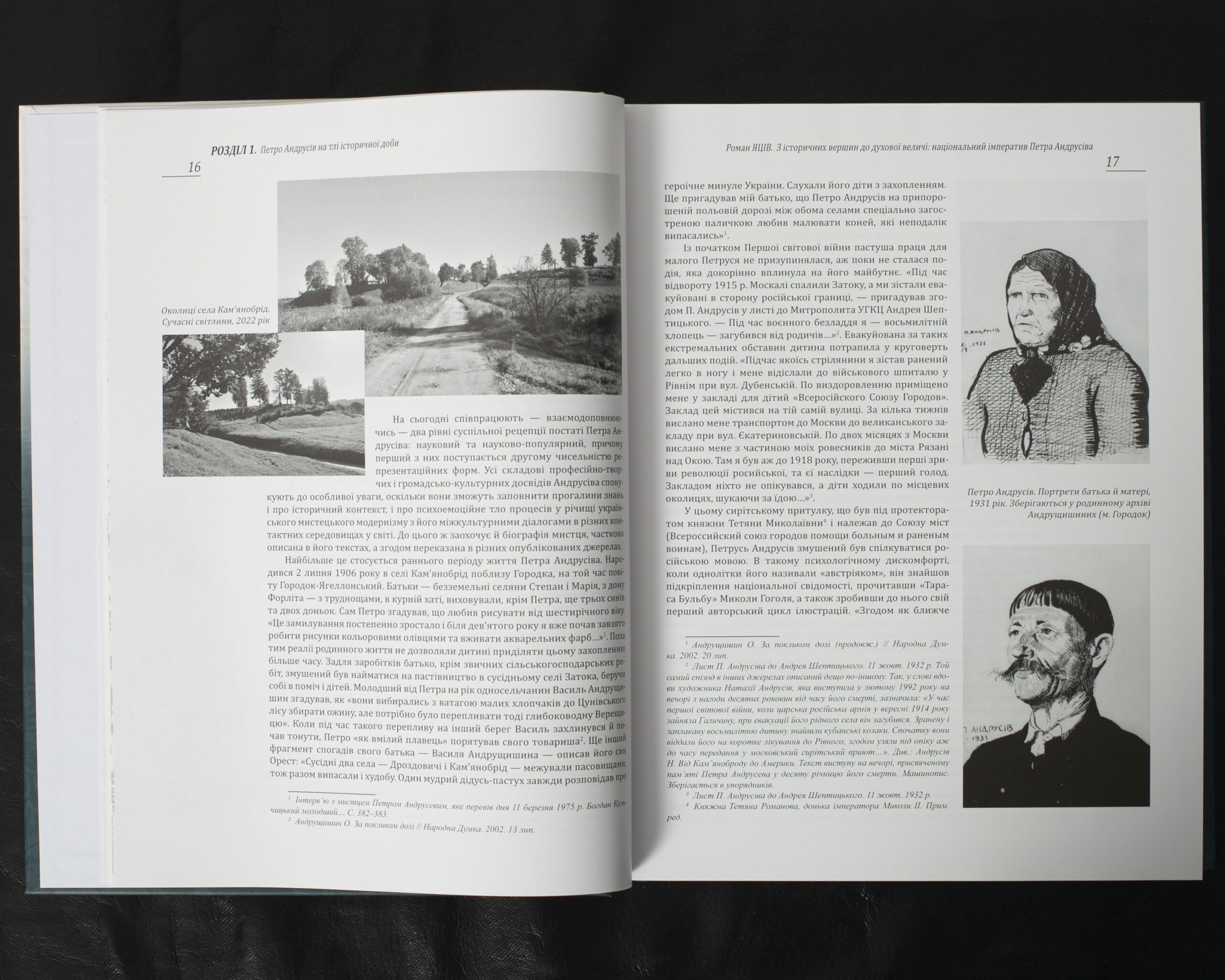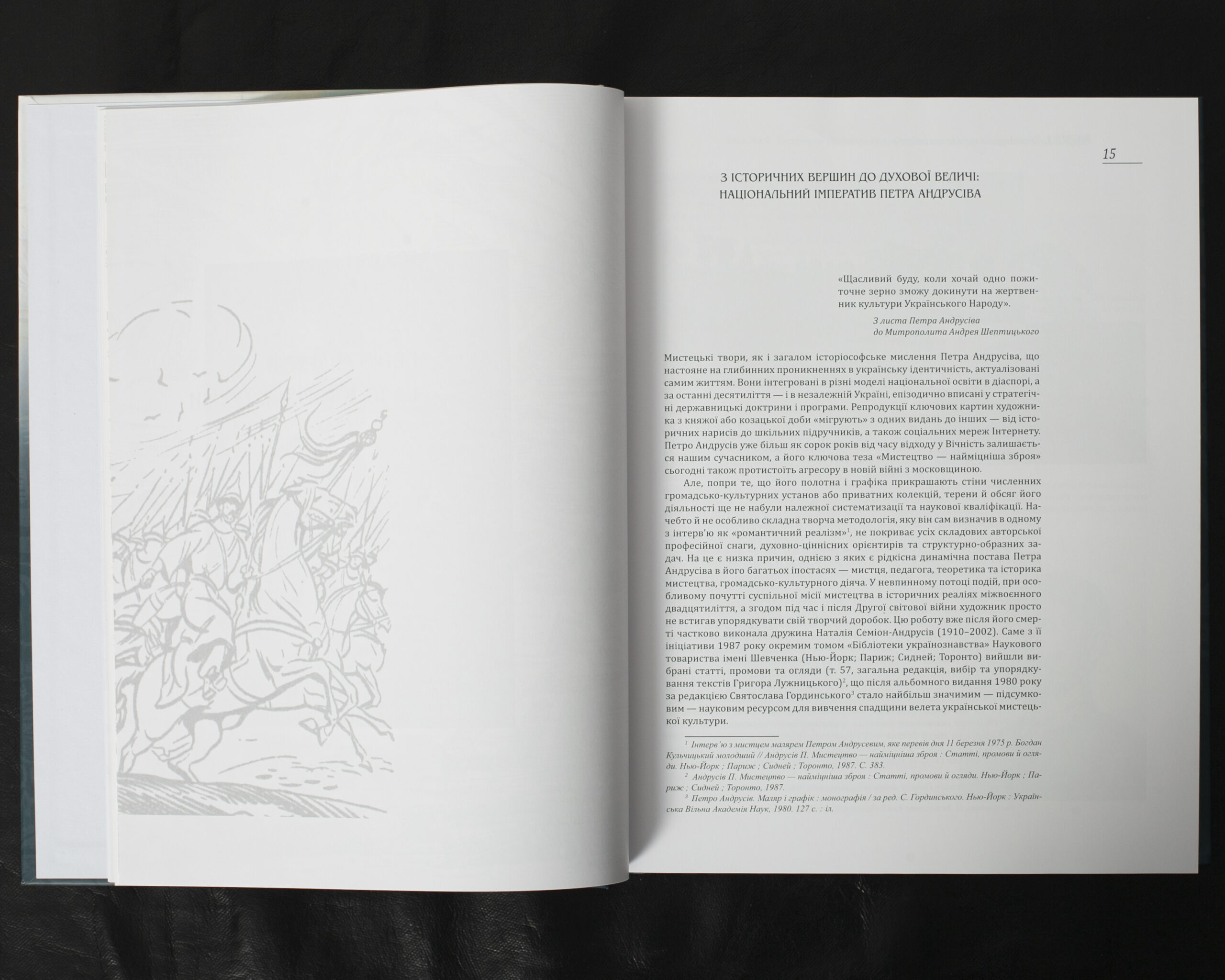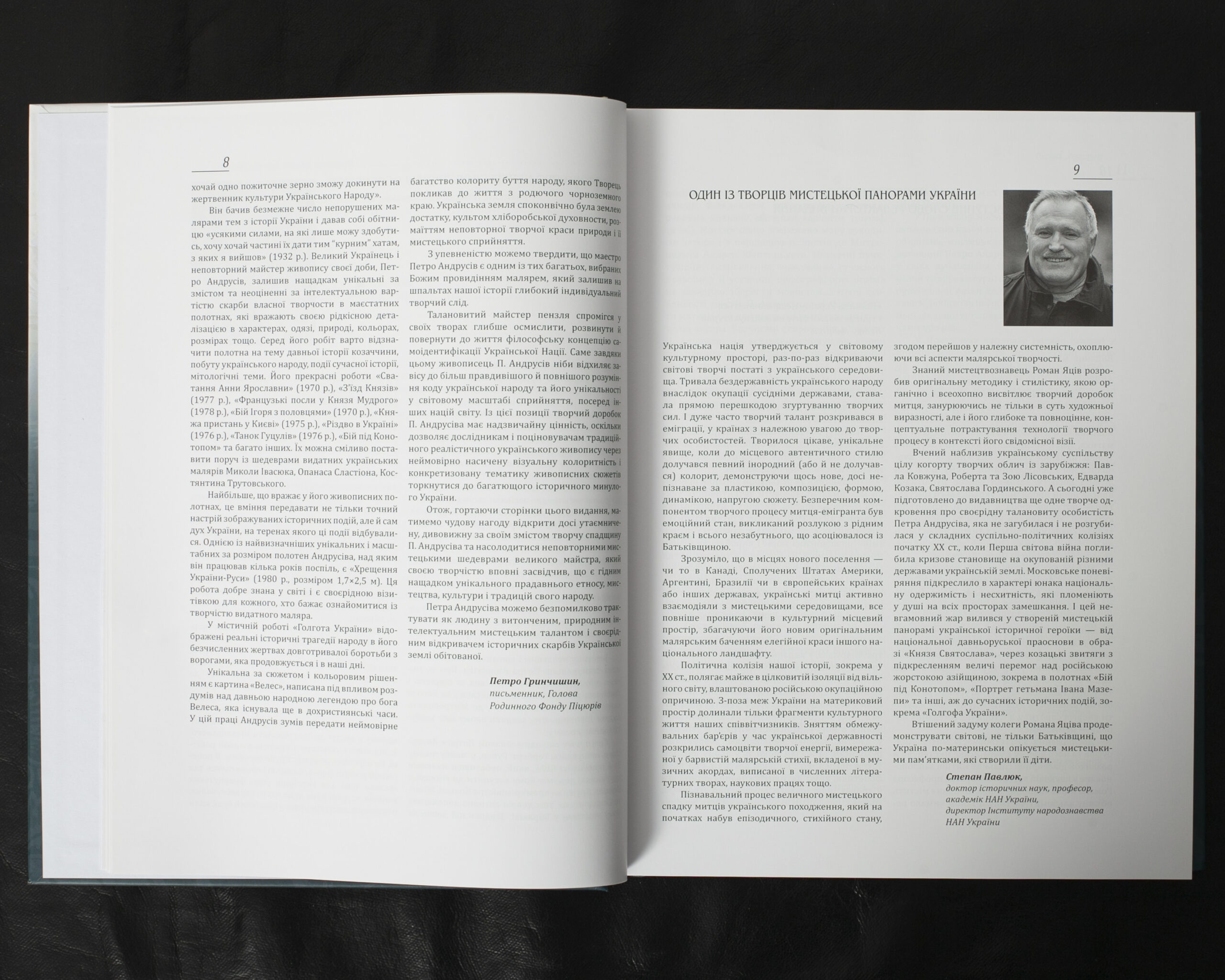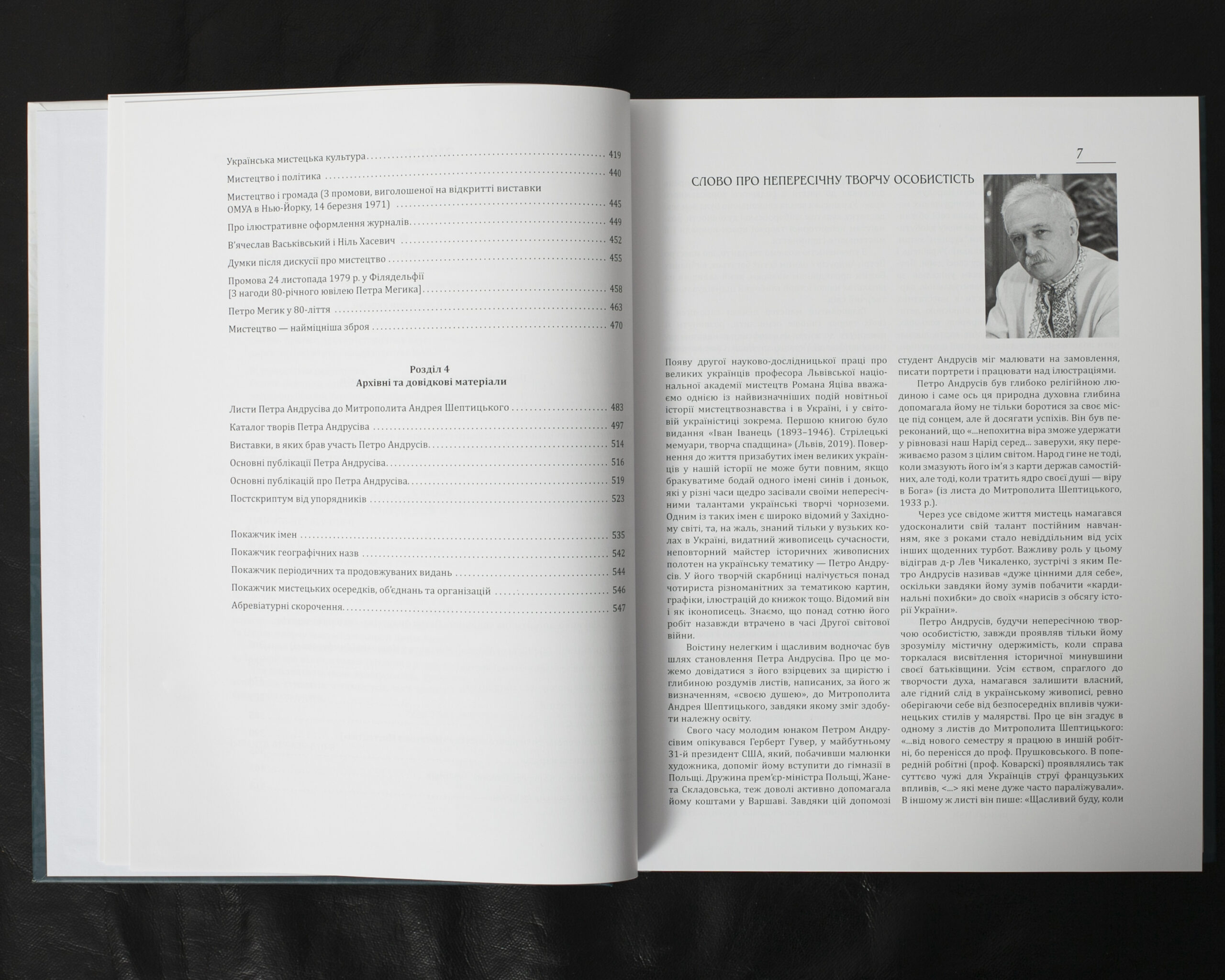 Монографія представляє багату мистецьку спадщину Петра Андрусіва, включаючи його живописні та графічні твори, мистецтвознавчі праці та епістолярій. Особливу цінність становить листування з Митрополитом Андреєм Шептицьким. Видання містить ґрунтовний науковий аналіз творчої біографії митця, його громадсько-культурної діяльності та теоретичних праць. Книга збагачена повним каталогом творів художника, бібліографією його публікацій, архівними фотографіями та документами, що вперше вводяться до наукового обігу.