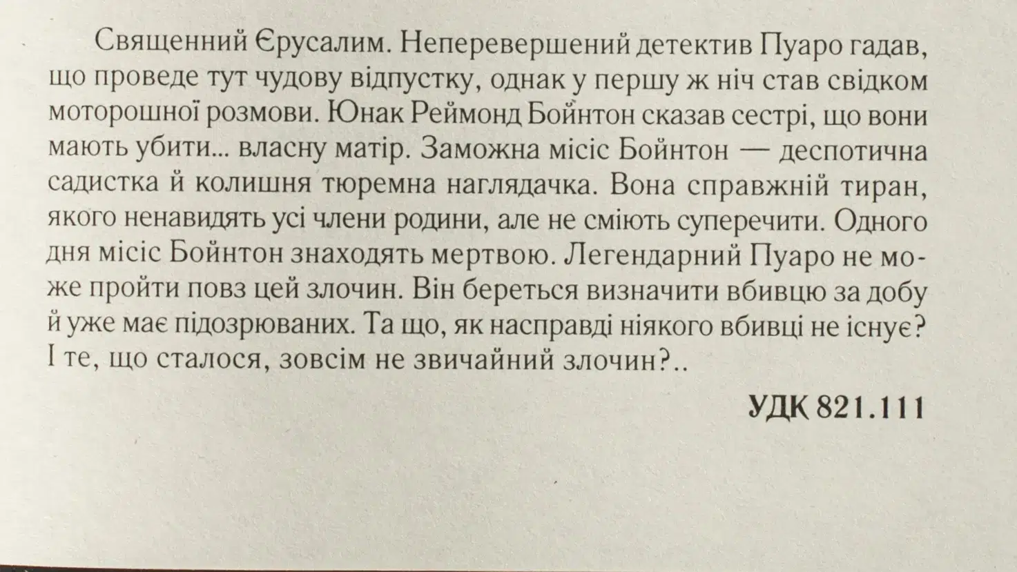 Священний Єрусалим. Неперевершений детектив Пуаро гадав, що проведе тут чудову відпустку, однак у першу ж ніч став свідком моторошної розмови. Юнак Реймонд Бойнтон сказав сестрі, що вони мають убити… власну матір. Заможна місіс Бойнтон — деспотична садистка й колишня тюремна наглядачка. Вона справжній тиран, якого ненавидять усі члени родини, але не сміють суперечити. Одного дня місіс Бойнтон знаходять мертвою. Легендарний Пуаро не може пройти повз цей злочин. Він береться визначити вбивцю за добу й уже має підозрюваних. Та що, як насправді ніякого вбивці не існує? І те, що сталося, зовсім не звичайний злочин…