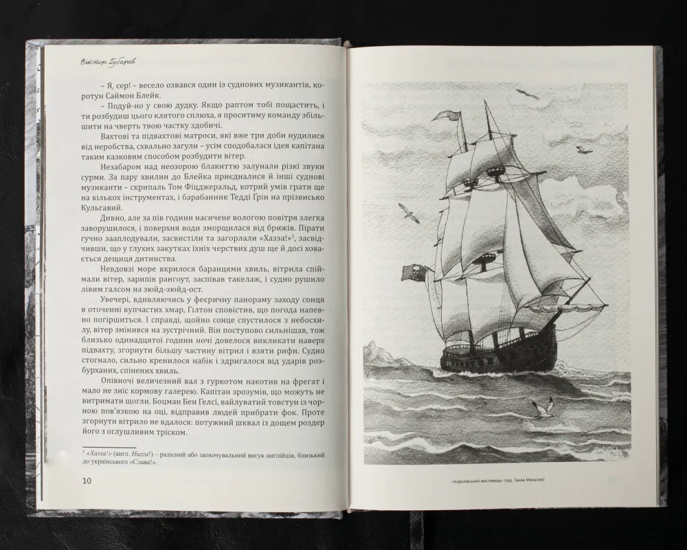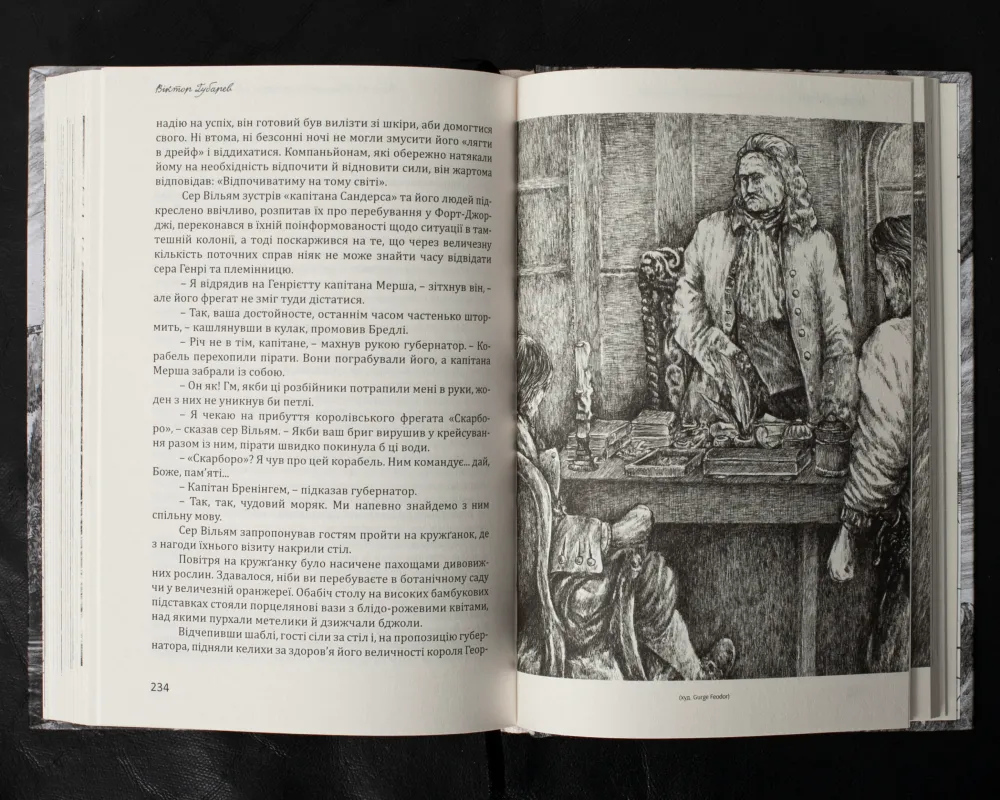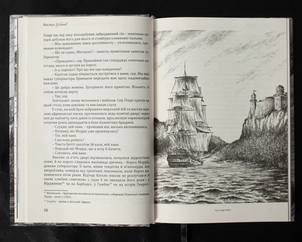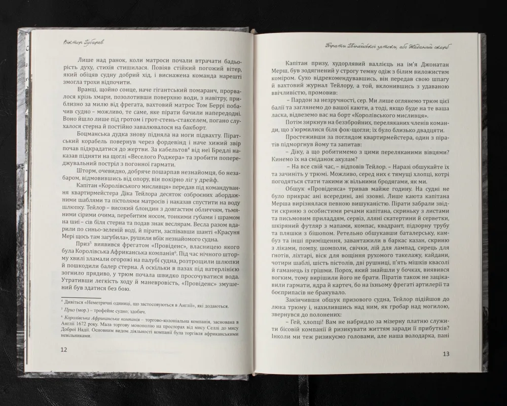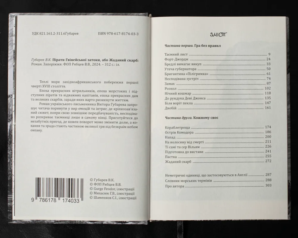 Друга книга – “Пірати Гвінейської затоки, або Жаданий скарб” – роман українського історика мореплавства Віктора Губарева. Дія роману відбувається в першій чверті XVIII століття в акваторії Гвінейської затоки (Африка). Твір запрошує читача поринути у вир емоцій та інтриг, де кріпкозав’язаний сюжет, попри свою зовнішню передбачуваність, несподівано розкриває таємниці лише в самому кінці. Приготуйтеся до незабутніх пригод, де кожен поворот може змінити долю, а кохання та зрада стають частиною великої гри під безкраїм небом океану.