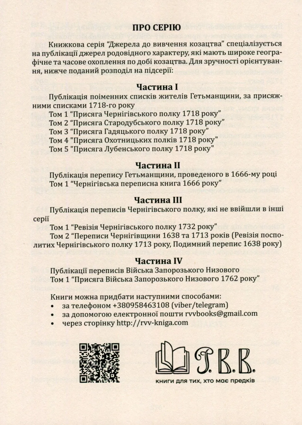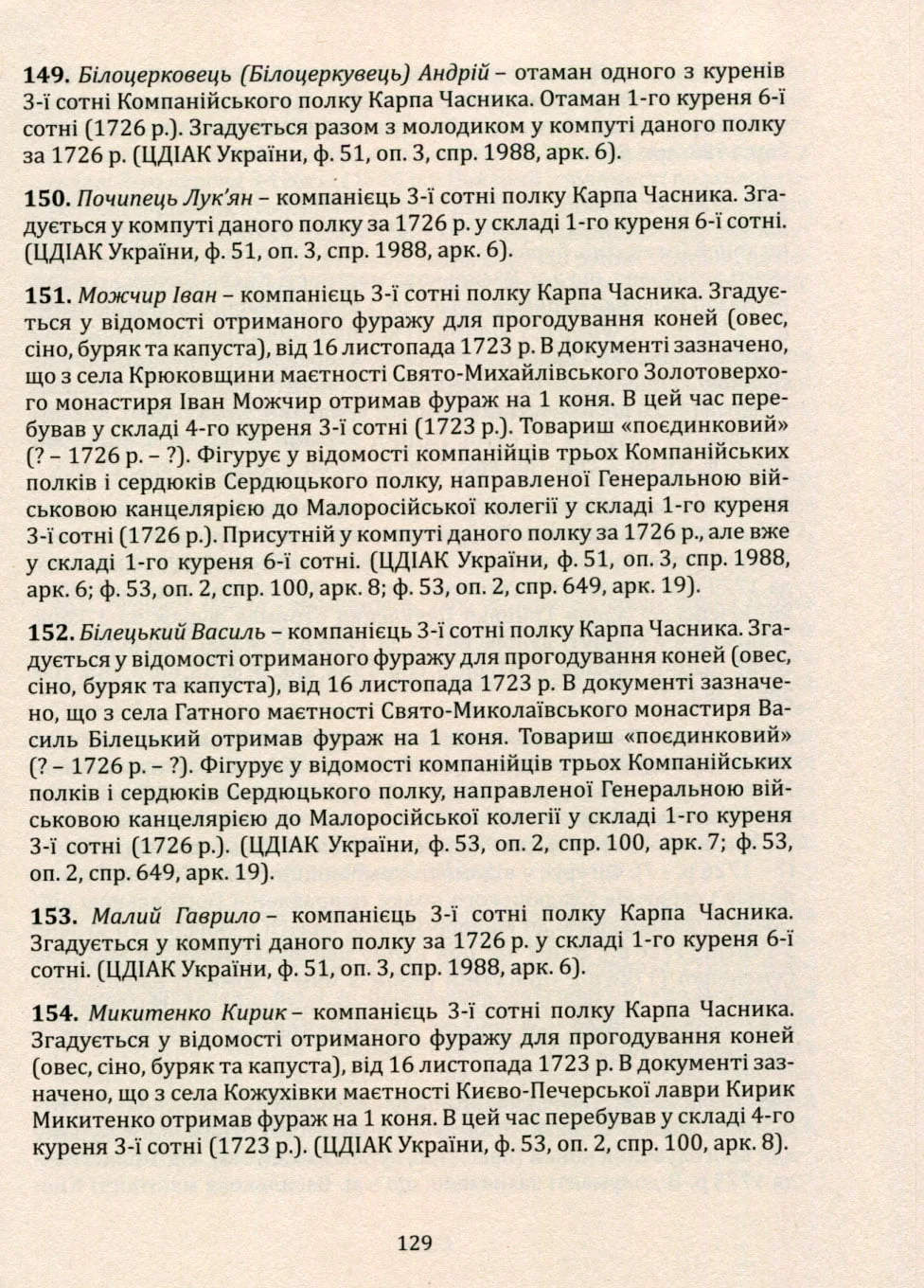 – Кількісний і персональний склад Охотницького (найманого) війська в Гетьманщині в першій чверті XVIII століття. Основа книги – іменні списки;