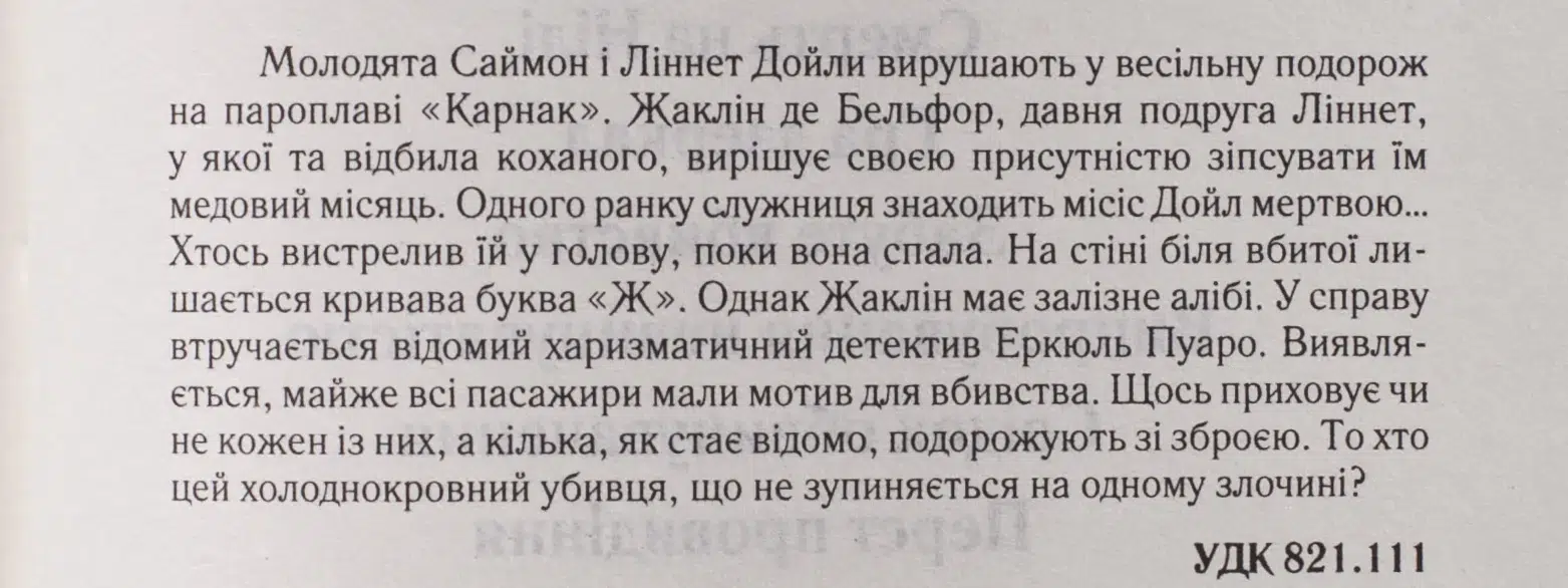 Один із найпопулярніших і найвизначніших романів Агати Крісті. Молодята Саймон і Ліннет Дойли вирушають у весільну подорож на пароплаві “Карнак”. Жаклін де Бельфор, давня подруга Ліннет, у якої та відбила коханого, вирішує своєю присутністю зіпсувати їм медовий місяць. Одного ранку служниця знаходить місіс Дойл мертвою… Хтось вистрелив їй у голову, поки вона спала. На стіні біля вбитої лишається кривава буква “Ж”. Однак Жаклін має залізне алібі. У справу втручається відомий харизматичний детектив Еркюль Пуаро. Виявляється, майже всі пасажири мали мотив для вбивства. Щось приховує чи не кожен із них, а кілька, як стає відомо, подорожують зі зброєю. То хто цей холоднокровний убивця, який не зупиниться на одному злочині?