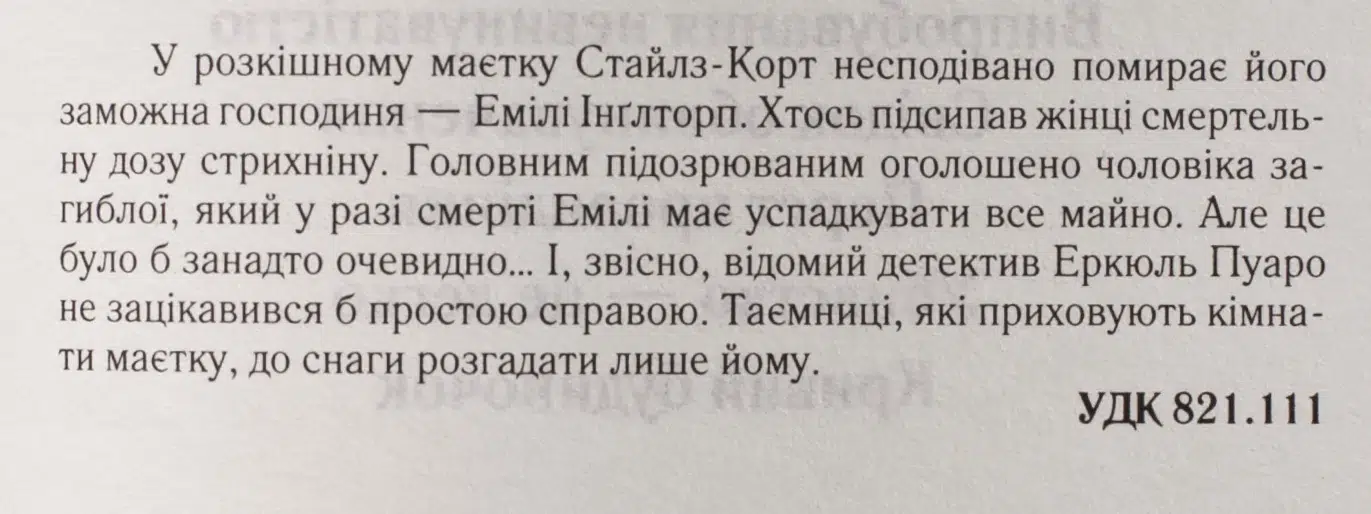 Перший детектив Агати Крісті! У розкішному маєтку Стайлз-Корт несподівано помирає його заможна господиня — Емілі Інглтроп. Хтось підсипав жінці смертельну дозу стрихніну. Головним підозрюваним оголошено чоловіка загиблої, який у разі смерті Емілі має успадкувати все майно. Але це було б занадто очевидно… І, звісно, відомий детектив Еркюль Пуаро не зацікавився би простою справою. Таємниці, які приховують кімнати маєтку, до снаги розгадати лише йому.