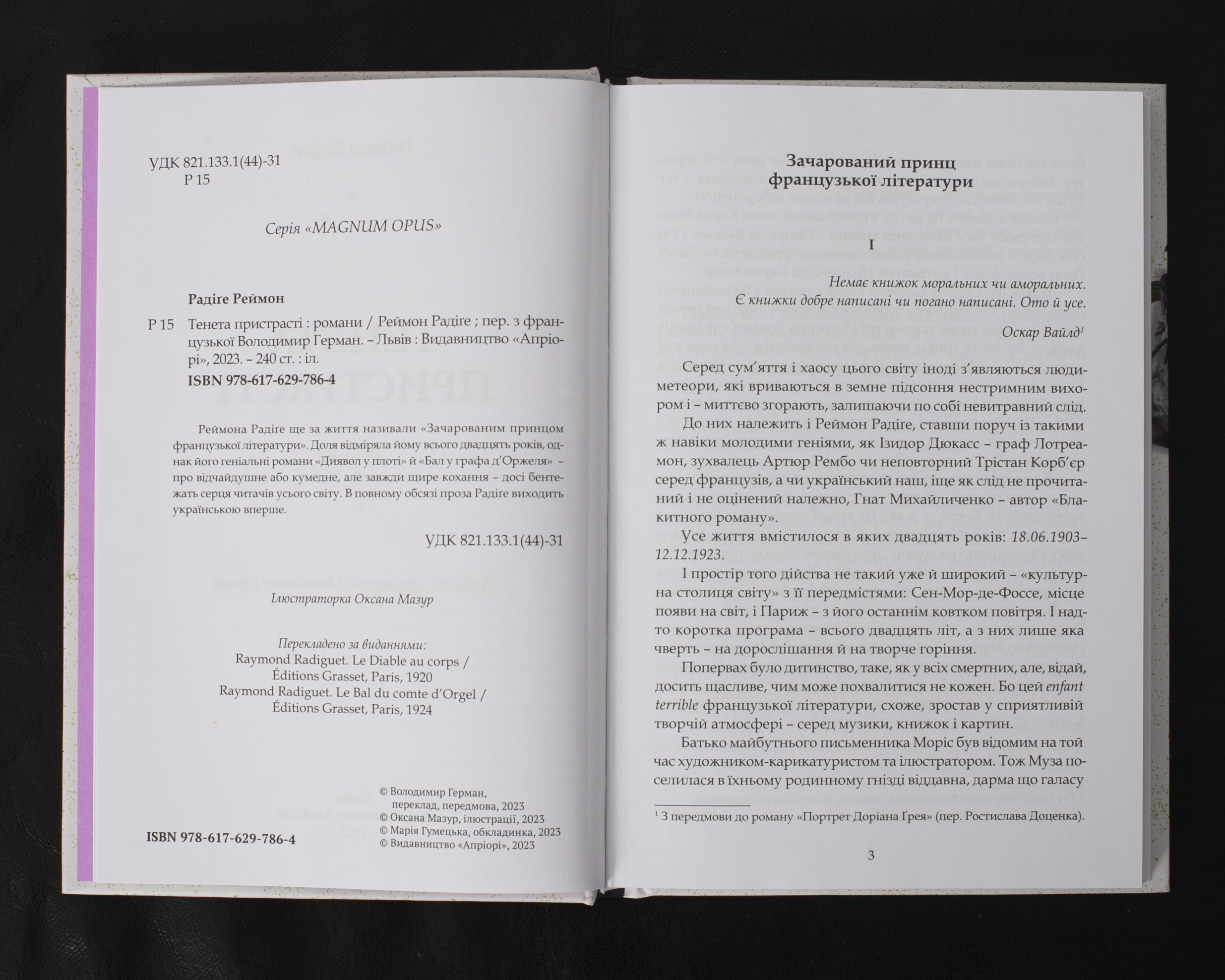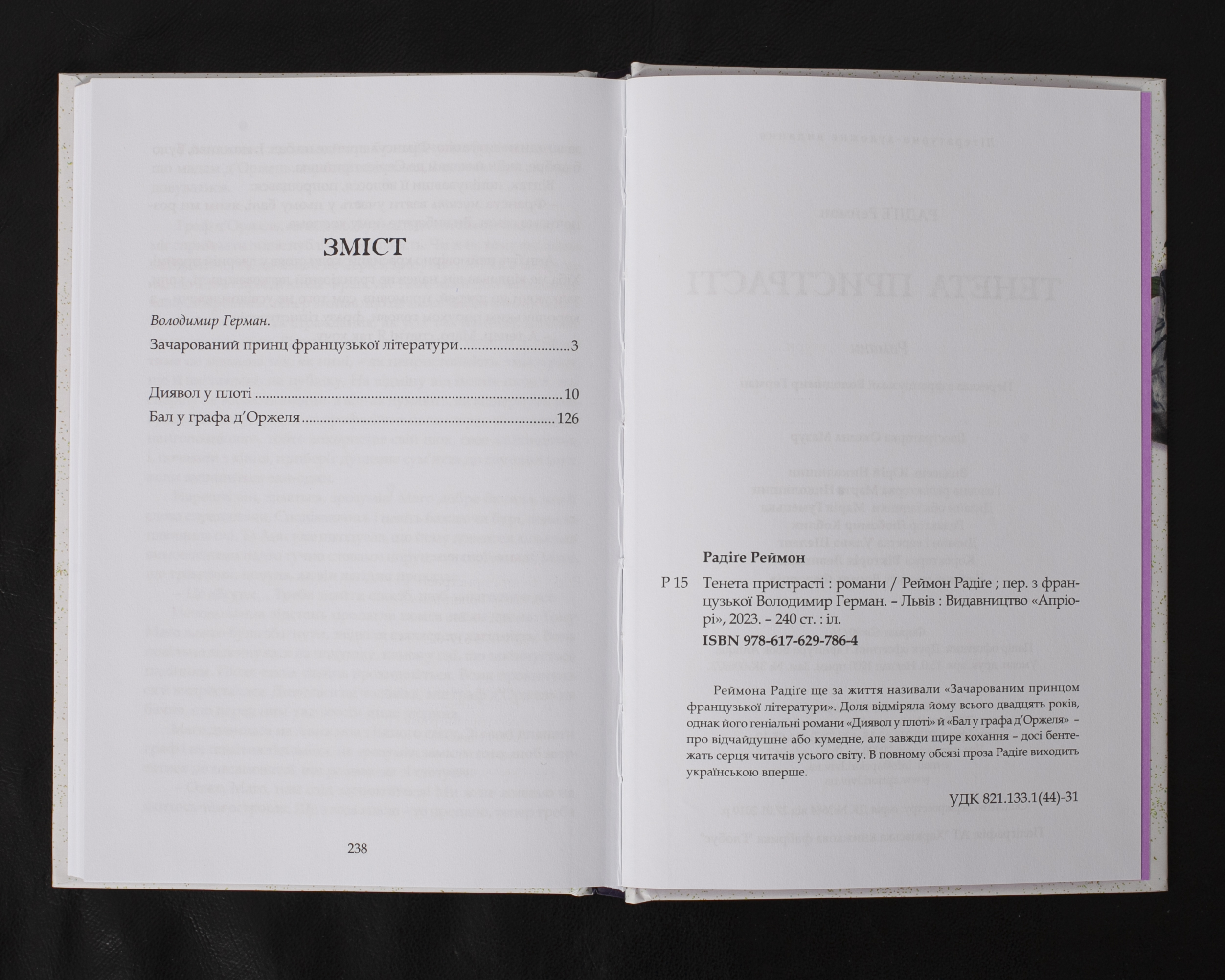 До збірки увійшли два найвідоміші романи Реймона Радіге – “Диявол у плоті” та “Бал у графа д’Оржеля”. Написані автором до його передчасної смерті у 20-річному віці, ці твори стали класикою французької літератури. В них майстерно змальовані історії пристрасного та щирого кохання, сповнені як драматизму, так і тонкого гумору. Вперше українською мовою публікується повне зібрання прози “зачарованого принца французької літератури”, як називали Радіге його сучасники.