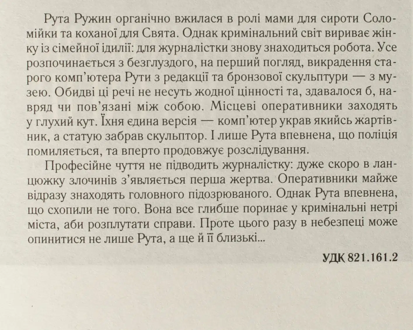 Рута Ружин органічно вжилася в ролі мами для сироти Соломійки та коханої для Свята. Однак кримінальний світ вириває жінку із сімейної ідилії: для журналістки знову знаходиться робота. Усе розпочинається з безглуздого, на перший погляд, викрадення старого комп’ютера Рути з редакції та бронзової скульптури – з музею. Обидві ці речі не несуть жодної цінності та, здавалося б, навряд чи пов’язані між собою. Місцеві оперативники заходять у глухий кут. Їхня єдина версія – комп’ютер украв якийсь жартівник, а статую забрав скульптор. І лише Рута впевнена, що поліція помиляється, та вперто продовжує розслідування. Професійне чуття не підводить журналістку: дуже скоро в ланцюжку злочинів з’являється перша жертва. Оперативники майже відразу знаходять головного підозрюваного. Однак Рута впевнена, що схопили не того. Вона все глибше поринає у кримінальні нетрі міста, аби розплутати справи. Проте цього разу в небезпеці може опинитися не лише Рута, а ще й її близькі…