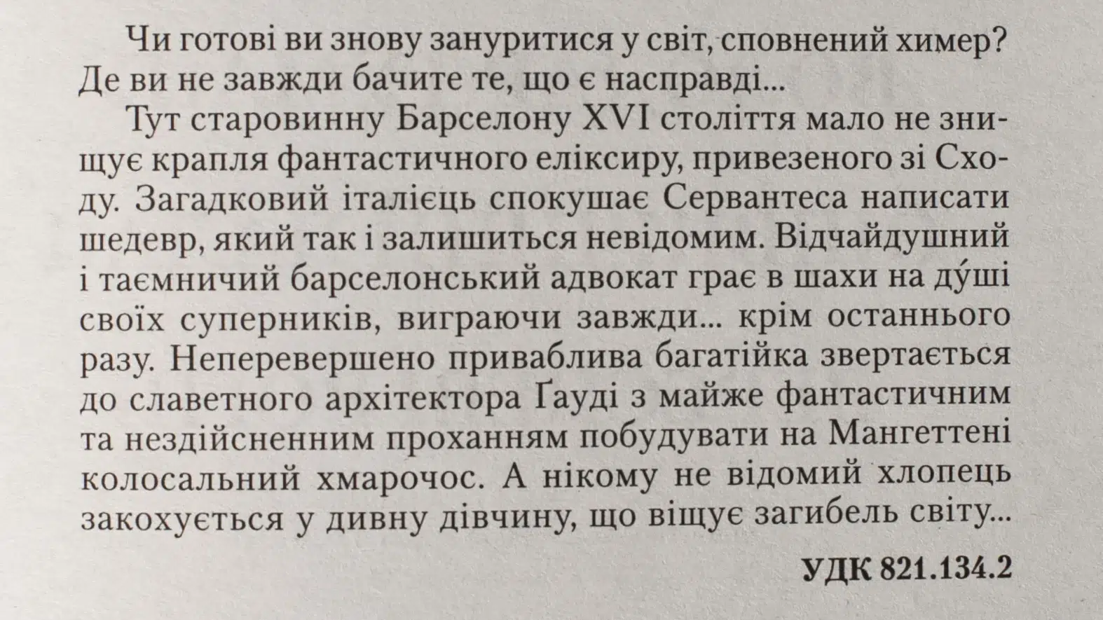 Тут старовинну Барселону XVI століття мало не знищує крапля фантастичного еліксиру, привезеного зі Сходу. Загадковий італієць спокушає Сервантеса написати шедевр, який так і залишиться невідомим. Відчайдушний і таємничий барселонський адвокат грає в шахи на душі своїх суперників, виграючи завжди… крім останнього разу. Неперевершено приваблива багатійка звертається до славетного архітектора Ґауді з майже фантастичним та нездійсненним проханням побудувати на Мангеттені колосальний хмарочос. А нікому не відомий хлопець закохується у дивну дівчину, що віщує загибель світу…