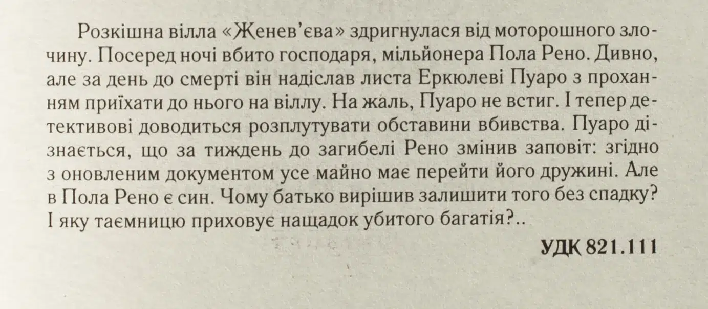 Розкішна вілла Женев’єва здригнулася від моторошного злочину. Убито французького багатія Поля Рено. Дивно, але за день до смерті він надіслав листа детективові Пуаро з проханням приїхати до нього на віллу. На жаль, Пуаро не встиг. І тепер детективові доводиться розплутувати обставини вбивства. Чоловік дізнається, що за два тижні до загибелі Рено змінив заповіт: згідно з оновленим документом усе майно мало перейти його дружині. Але в Поля Рено був пасинок. Чому прийомний батько вирішив залишити того без спадку? І яку таємницю має нащадок французького багатія?..