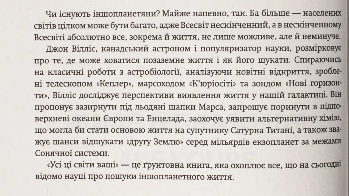 «Усі ці світи ваші» — це ґрунтовна книга, яка охоплює все, що на сьогодні відомо науці про пошуки іншопланетного життя.