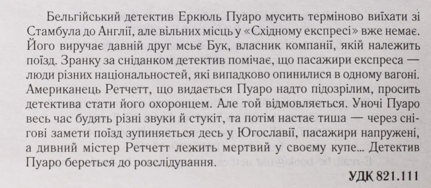 Автор: Агата Крісті (1890 – 1976) – англійська письменниця, яку знають у всьому світі як королеву детективу. Продано близько мільярда примірників її творів англійською мовою, ще один мільярд – у перекладі ста іноземними мовами. Вона – найпопулярніший автор усіх часів. За кількістю перевидань її книжки поступаються лише Біблії та творам Шекспіра.