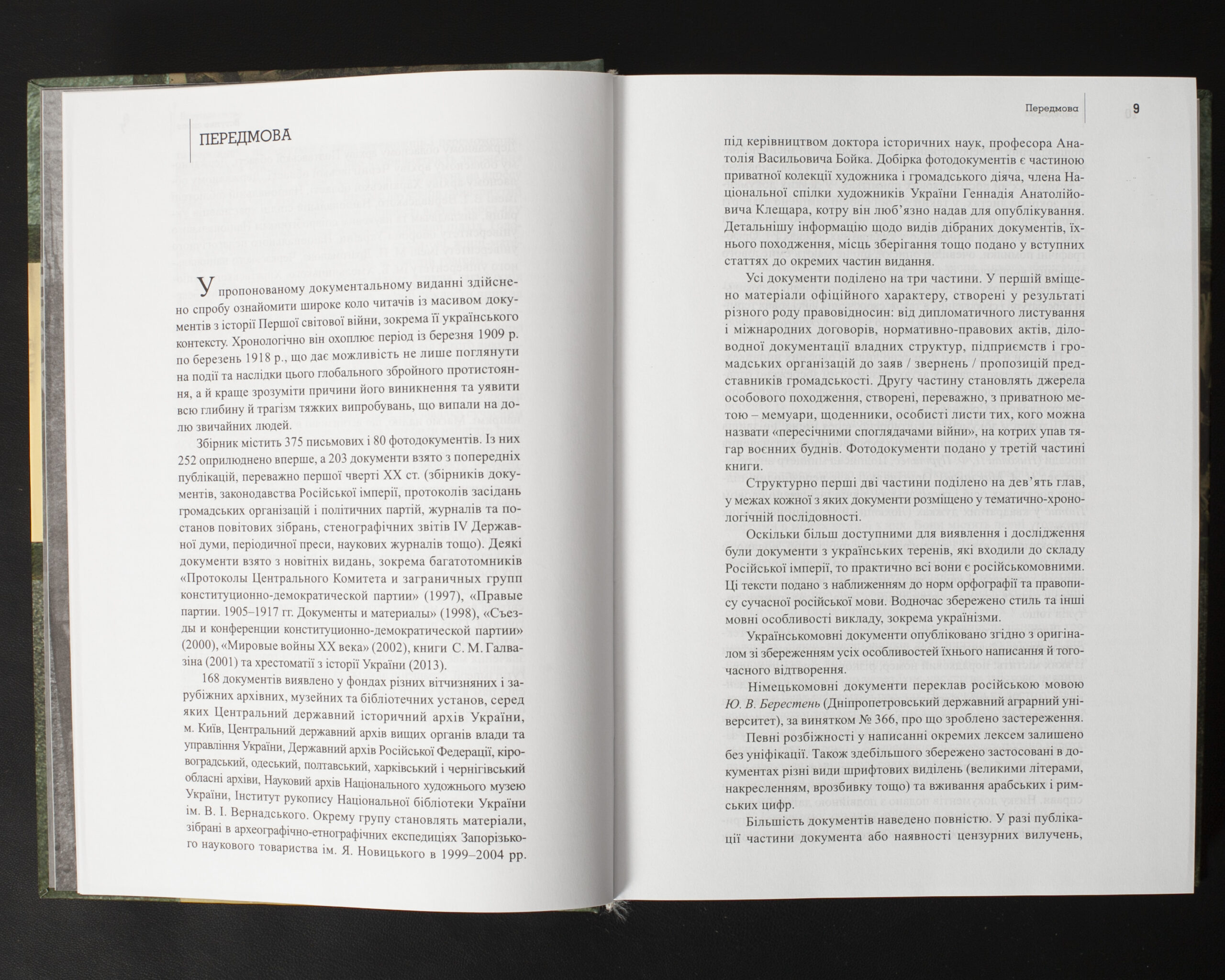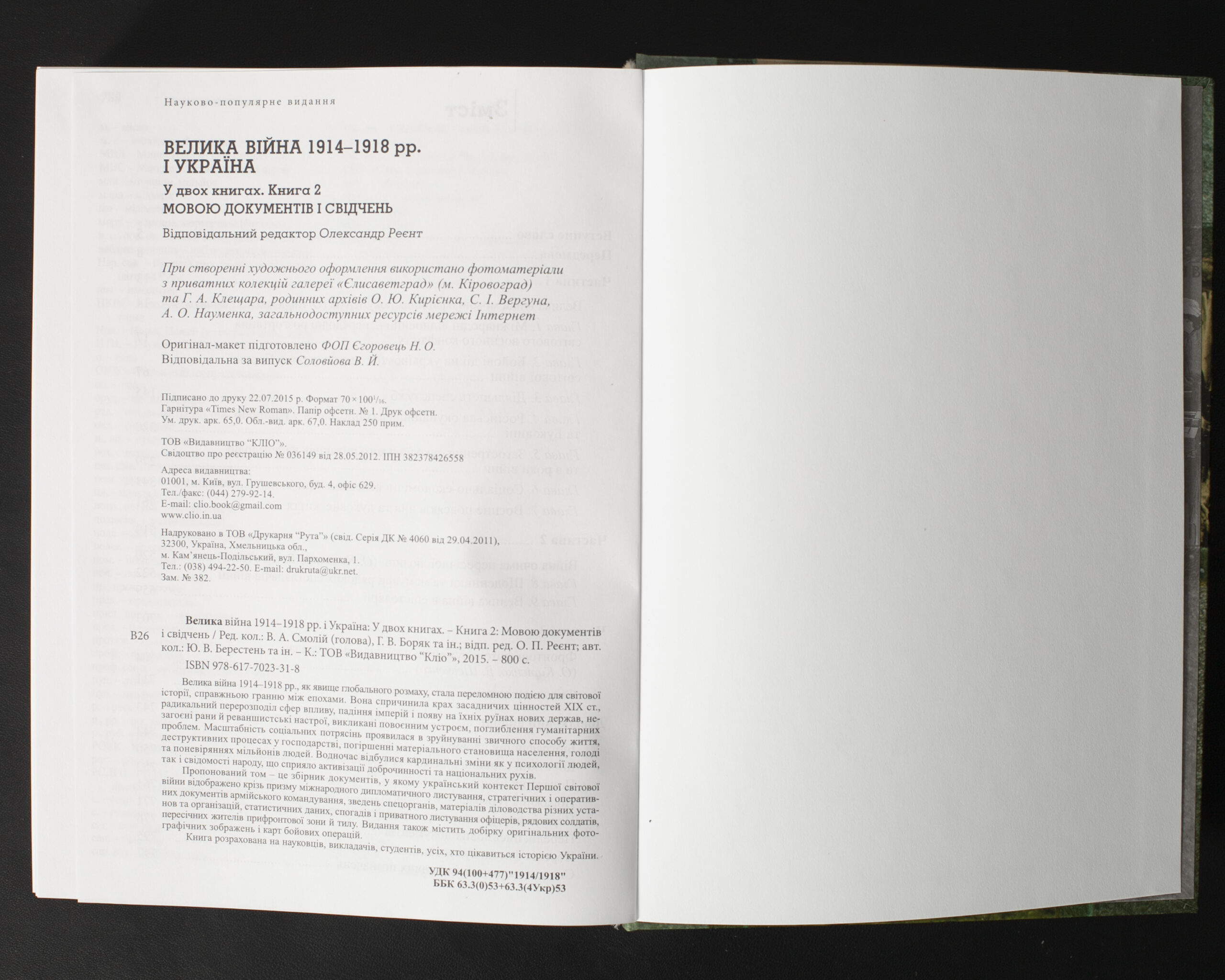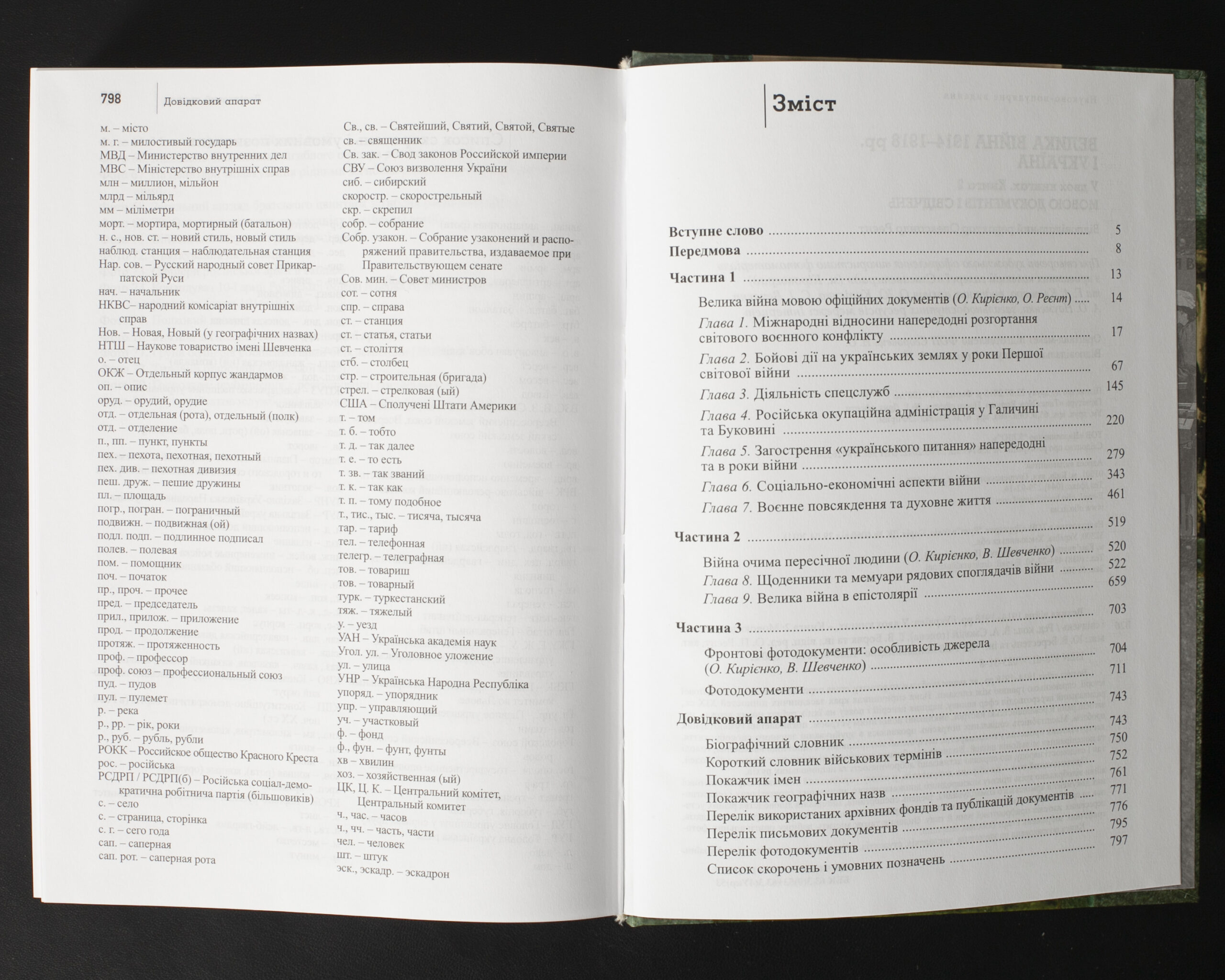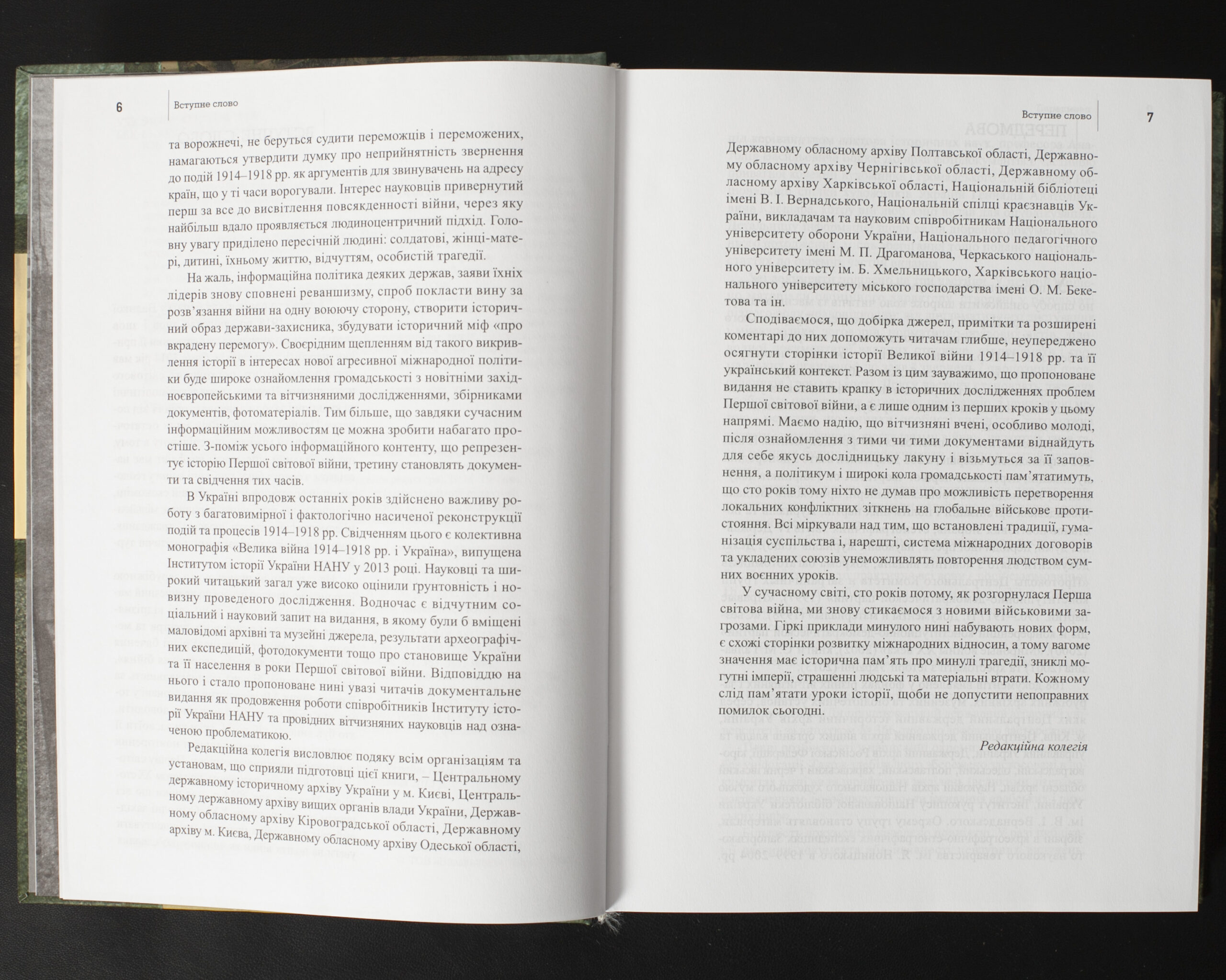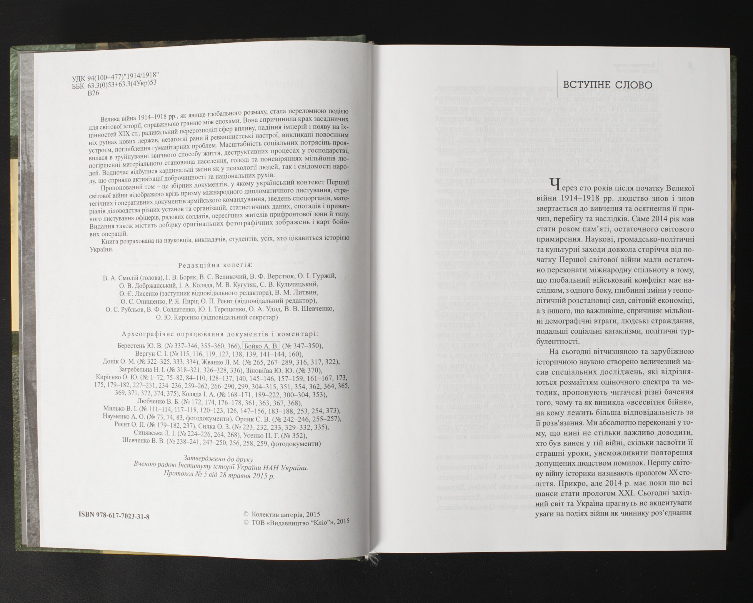Це видання Інституту історії України НАН України представляє унікальну збірку документів, що відображають український контекст Першої світової війни 1914–1918 рр. Автори розглядають війну як переломну подію світової історії, що спричинила крах цінностей ХІХ ст., падіння імперій, появу нових держав та кардинальні зміни в психології людей і свідомості народів.
