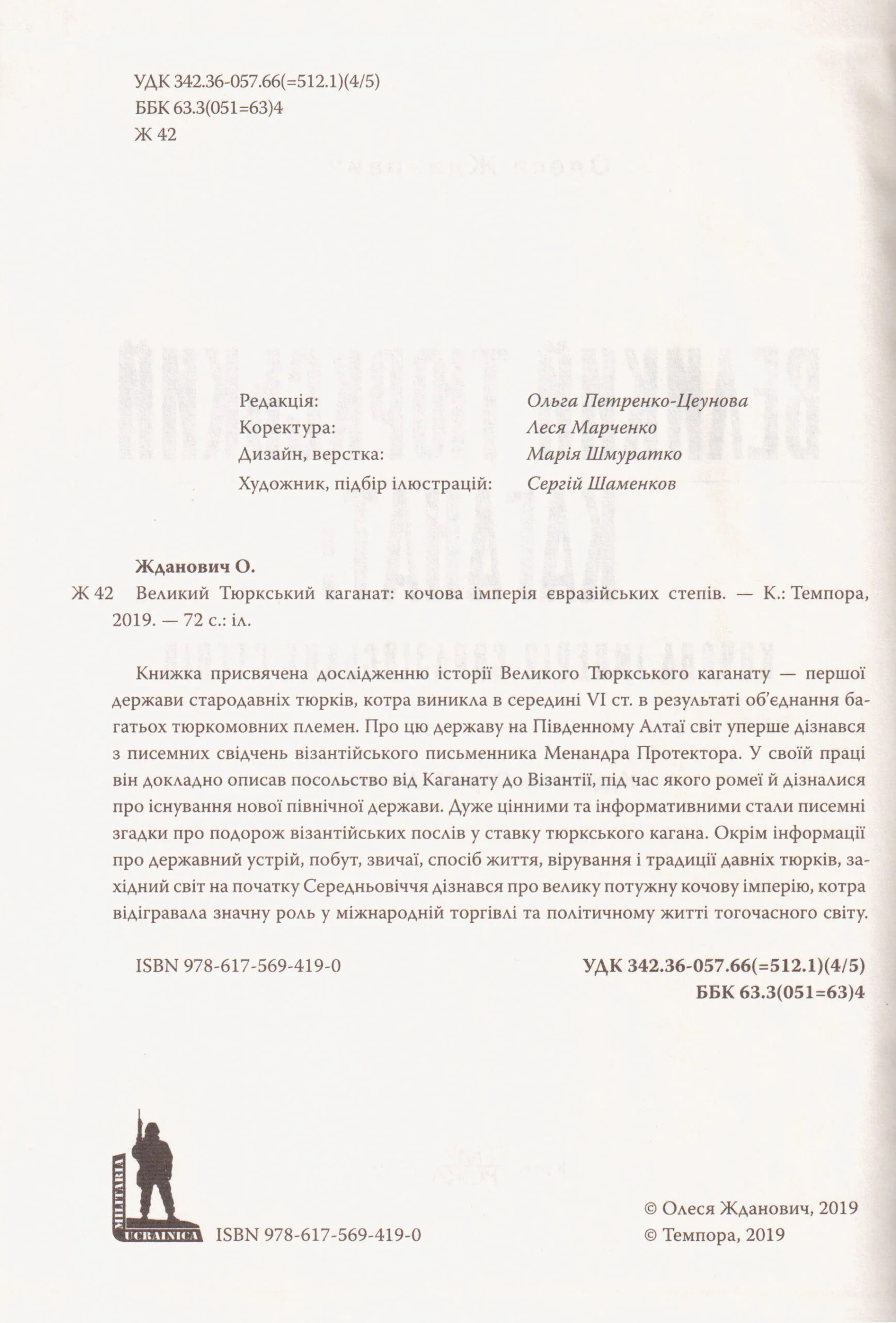 Книжка присвячена дослідженню історії Великого Тюркського каганату — першої держави стародавніх тюрків, котра виникла в середині VI ст. в результаті об’єднання багатьох тюркомовних племен. Про цю державу на Південному Алтаї світ уперше дізнався з писемних свідчень візантійського письменника Менандра Протектора. У своїй праці він докладно описав посольство від Каганату до Візантії, під час якого ромеї й дізналися про існування нової північної держави. Дуже цінними та інформативними стали писемні згадки про подорож візантійських послів у ставку тюркського кагана. Окрім інформації про державний устрій, побут, звичаї, спосіб життя, вірування і традиції давніх тюрків, західний світ на початку Середньовіччя дізнався про велику потужну кочову імперію, котра відігравала значну роль у міжнародній торгівлі та політичному житті тогочасного світу.