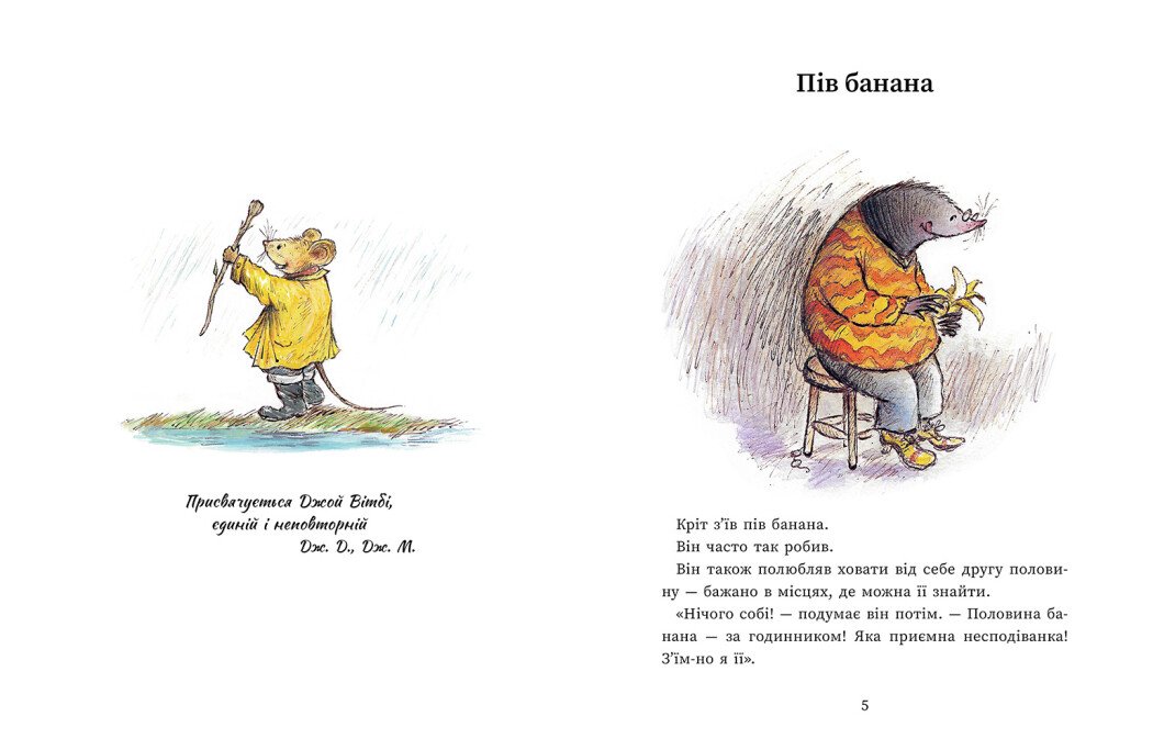 Ця книжка для родинного читання продовжує серію історій про двох друзів — Миша і Крота — відомої британської дитячої письменниці, авторки багатьох бестселерів Джойс Данбар. Спочатку Миш і Кріт засумують, але потім зрозуміють, що прості радощі розвіюють смуток, а в житті бувають речі єдині й неповторні. Та самі Миш і Кріт, якщо подумати, теж такі!